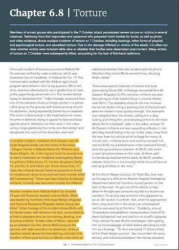 Some of the Most Horrific Atrocities – as Documented in The Roberts Report (If such a distinction is even possible) 📍 Burned Alive, Embracing One Another Charred bodies were found tightly bound together—an Israeli mother and child tied with metal wire and burned alive. Medical evidence confirmed they were still breathing during the fire, as soot was found in their airways. 📍 Beheadings Captured on Camera A video from Kibbutz Nahal Oz shows a Gazan civilian attempting to behead a wounded Thai worker with a hoe. The victim was still alive but too injured to move. Additional beheadings—some post-mortem—were documented and shared on Telegram. Several bodies were found with facial disfigurements and eyes gouged from their sockets. 📍A Soldier’s Body, Shown with a Fake Head In one case, a murdered soldier was decapitated. But his family was not initially told; his body was presented with a mannequin head to spare them further trauma. Only weeks later did they learn the truth, and the grave was reopened so the head could be buried alongside the rest of the body. 📍 Torture Using Electrical Cords Many bodies were found bound with household electrical wires, tightly looped around the wrists. In some cases, the cords tore through the skin, and limbs were either crushed or severed. 📍 A Baby Severely Burned – Kibbutz Kfar Aza The Golan family hid in their safe room as terrorists tried to smoke them out with a burning tire. When that failed, the attackers ignited a gas canister inside the house. The mother suffered second- and third-degree burns over 60% of her body. The father sustained burns to 45%. Their infant daughter was burned over 30% of her body and remained in a coma for 8 days. 📍Gang Rape and Brutal Murders At the Nova music festival, one survivor recounted a chilling scene: a red-haired woman was gang raped repeatedly. Each time she moved, one of her attackers stabbed her in the back. Another case described a woman who was raped and then had her breasts sliced off with a box cutter. “One continues to rape her, and the other throws her breast to someone else, and they play with it, throw it, and it falls on the road.” 📍 The Youngest Victim: A 14-Hour-Old Baby Born on October 6, 2023, in the NICU at Soroka Hospital, the baby returned home with her parents to Kibbutz Bar’am just hours before the attack. She was shot and killed while being held in her mother’s arms. 📍 The Oldest Victim: A 92-Year-Old Holocaust Survivor She was murdered in her home by Hamas terrorists. Her body was only identified days later due to its condition. Let’s close with a few quotes from survivor testimonies—raw, firsthand accounts that need no commentary. Just their words. 👇