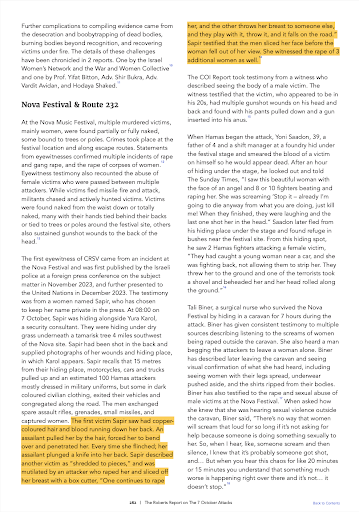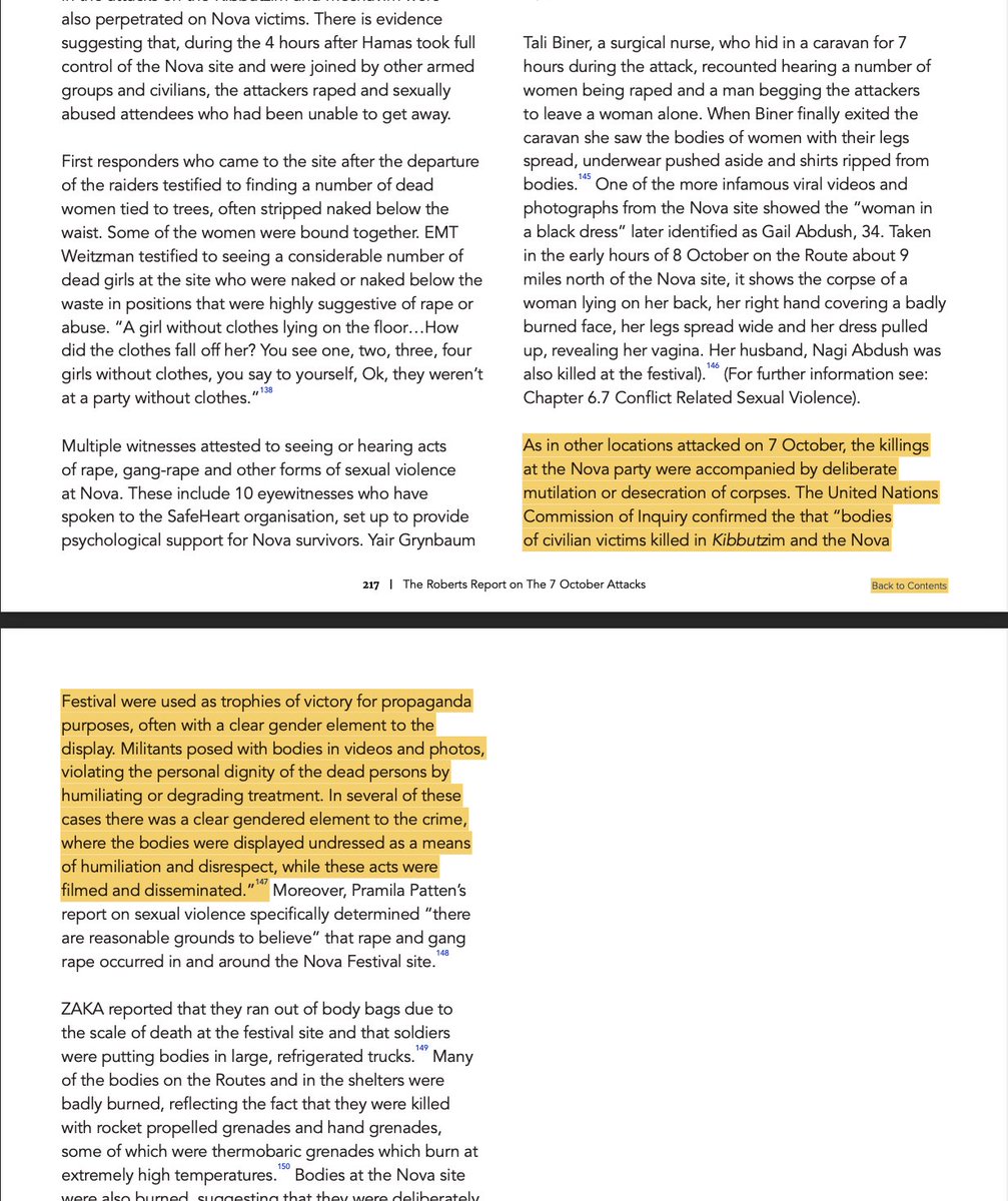 Survivor testimonies: 📍Tali Biner A surgical nurse who survived the Nova Festival by hiding in a caravan for seven hours. She described hearing prolonged screams of women being raped, and later confirmed her fears upon seeing the bodies of naked women with signs of sexual assault. Biner emphasized the unmistakable horror in the victims’ screams and also testified to the rape of male victims. 📍 Gad Liebersohn While hiding in the forest after fleeing the festival, Liebersohn recounted hearing English-speaking girls screaming “Help,” “No,” and “Please.” He heard them cry, followed by gunshots and silence. He could hear girls being taken to pickup trucks, raped, and shot. 📍Ron Freger Hid in a dry riverbed for four and a half hours. He heard a girl nearby screaming “they are raping me, help me,” followed by a gunshot to the head. His testimony was provided to The Open University. 📍Rami Shmuel CEO of UNITY Festival Israel and Nova organizer. He returned to the festival site and found naked female bodies, some butchered. He testified about the scale of sexual violence committed in open fields near the safe zone. 📍 Elad Avraham Security supervisor at the Nova Festival. Fought off attackers using a fallen officer’s weapon. After helping people escape, he returned to the scene and led an 8-man team in a firefight against 30 terrorists for 90 minutes. 📍 Elizabeth Chinsome Anwuku She and her friends hid in a thicket west of the festival. “We heard people screaming, we saw people falling, we were between booms and gunshots, and we were trapped.” Footage she filmed captured relentless gunfire drawing closer. 📍 Halely A 21-year-old woman who hid under a stage. She described the group being frozen in fear while gunshots grew louder. “People screaming, begging… and then bang, silence.” She later ran while bullets whizzed over her head, seeking shelter behind a tank. 📍Noam Ben David An artist who, with her boyfriend David Newman, hid in a trash container. She described hearing Arabic and gunfire around them and watching other survivors call loved ones, begging for rescue. These are just a tiny fraction of the countless harrowing testimonies included in The Roberts Report. Let’s now look at some of the broader statements included in the report regarding the behavior and patterns of the attackers. 👇