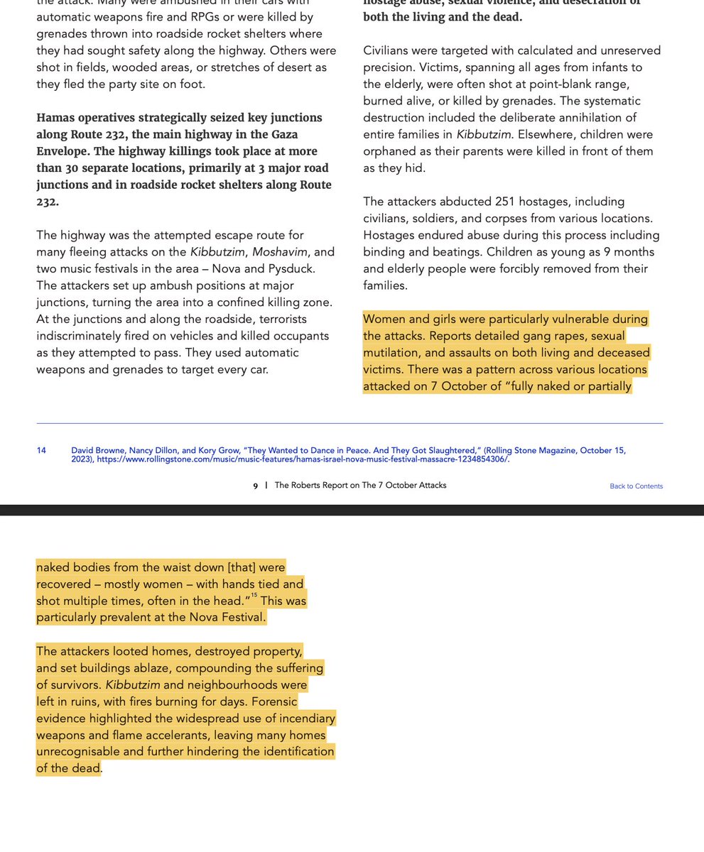 📍Bodies Used as Trophies Victims from the kibbutzim and the Nova festival were used as propaganda trophies. Militants posed with the bodies, often stripped and humiliated—especially women—filming and sharing the footage to degrade and dehumanize them. 📍Destroying Communities Attackers also looted homes, set fire to buildings, and used incendiary weapons, leaving entire communities in ruins. Fires burned for days, and many victims were left unidentifiable. 📍Sexualized Torture by Fire Women and girls were especially targeted during the attacks, with reports of gang rapes, sexual mutilation, and assaults—even on corpses. Many female bodies were found partially or fully naked, hands bound, and shot—often in the head. This was especially prevalent at the Nova Festival. Forensic analysis showed indications that gasoline was used to set victims’ genitals on fire, which was corroborated by a video of a female victim who was set on fire with gasoline from the waist down. Finishing with final thoughts on the report for now👇