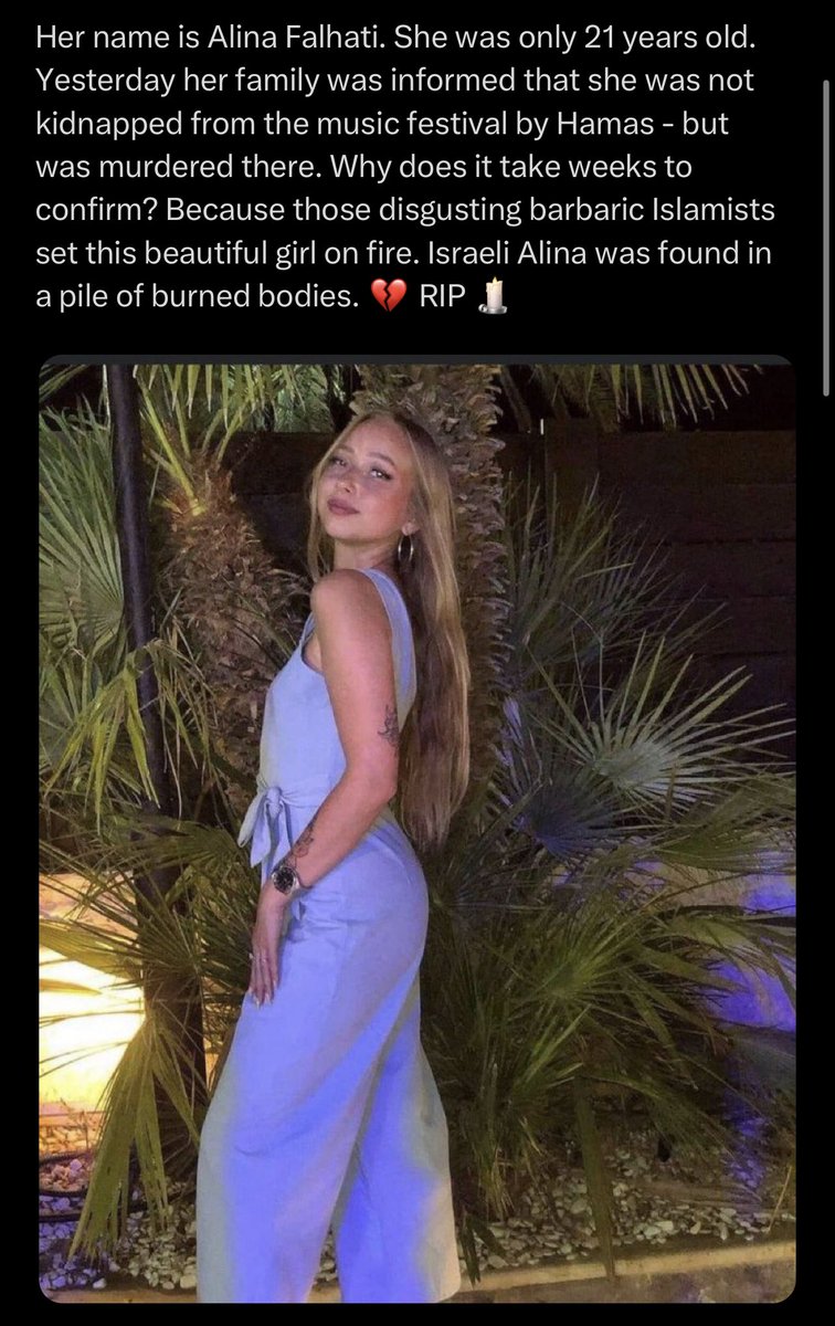 Mother of Naama Levy who was brutally raped on Oct 7th and had her ankles slit to stop her running away speaks out. "The woman in the Hamas video is my daughter. There are 17 young women who are still being held hostage. One of them is my daughter, Naama. And time is running out. Naama is only 19 years old, but she will always be my baby. What would you do if your daughter was held hostage by rapists and violent murderers for two months? Perhaps the better question is: What wouldn't you do? Time is running out for the Israeli prisoners in Gaza. We have already seen the monstrous evil that Hamas is capable of, especially against young women. The whole world, which still has a conscience, must demand that they be returned home. There are seventeen young women still in captivity. They range in age from 18 to 26. I think of what they, and my Naama, could be subjected to at every moment of the day. Each minute is an eternity in hell.” — Ayelet Levy Shachar, mother of Naama Levy. Source: The Free Press
