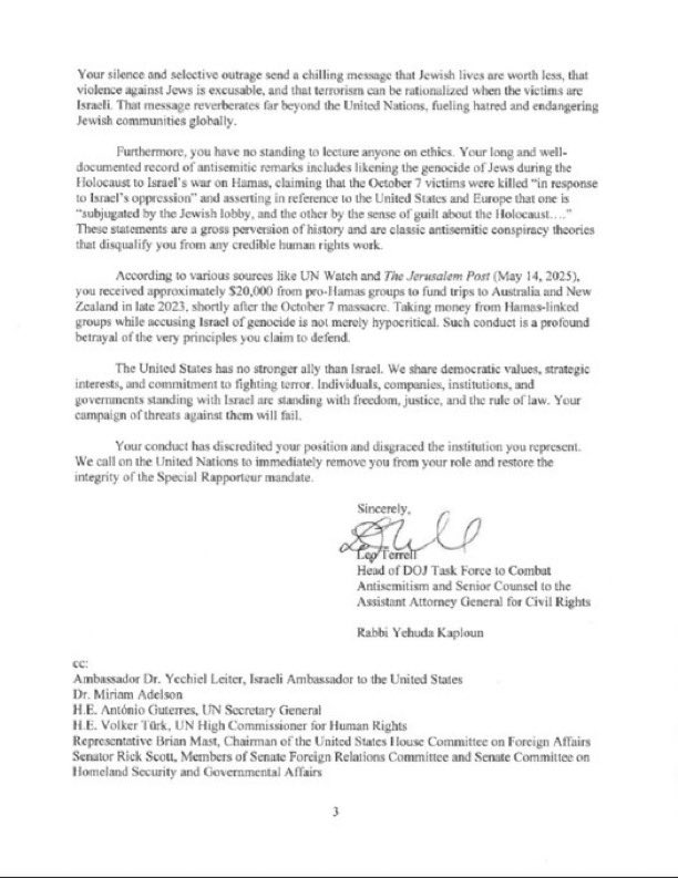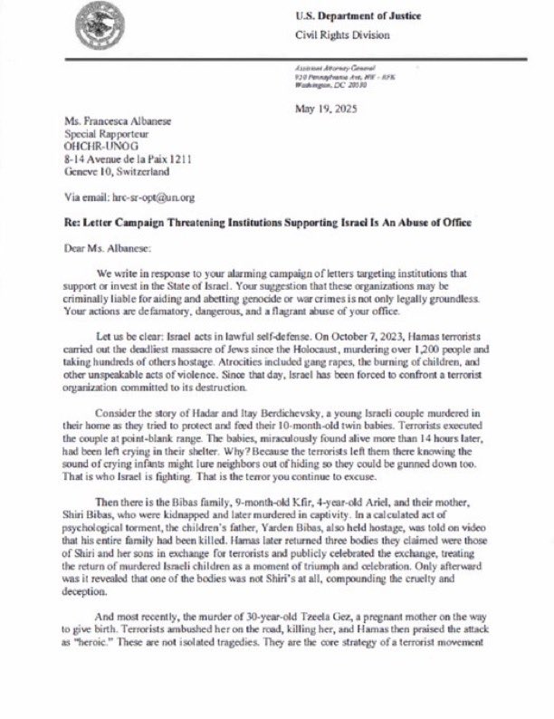 BOOM💥 The U.S. Department of Justice dropped the hammer on Francesca Albanese. They exposed her antisemitic lies, her defense of Hamas, and her abuse of power as a UN “human rights” official. And get this—she allegedly took $20,000 from pro-Hamas groups for “trips,” all while pushing blood libel and pretending to care about human rights. The letter ends with a clear demand: REMOVE Francesca Albanese immediately. Do you think the UN will actually boot her? Or are they too far gone to care?