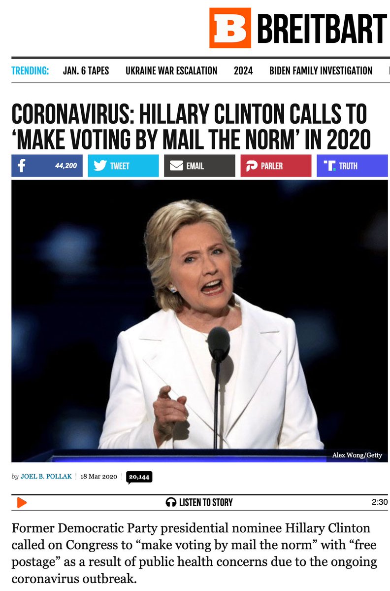 Actually, Bobby is wrong. If Ivermectin or HCQ was found to be effective, Hillary wouldn't have gotten what she wanted. No mail in voting. Bobby is confusing one of the ulterior motives for the primary motive, which Hillary laid out beautifully. Not 200 dead, March 18, 2020: