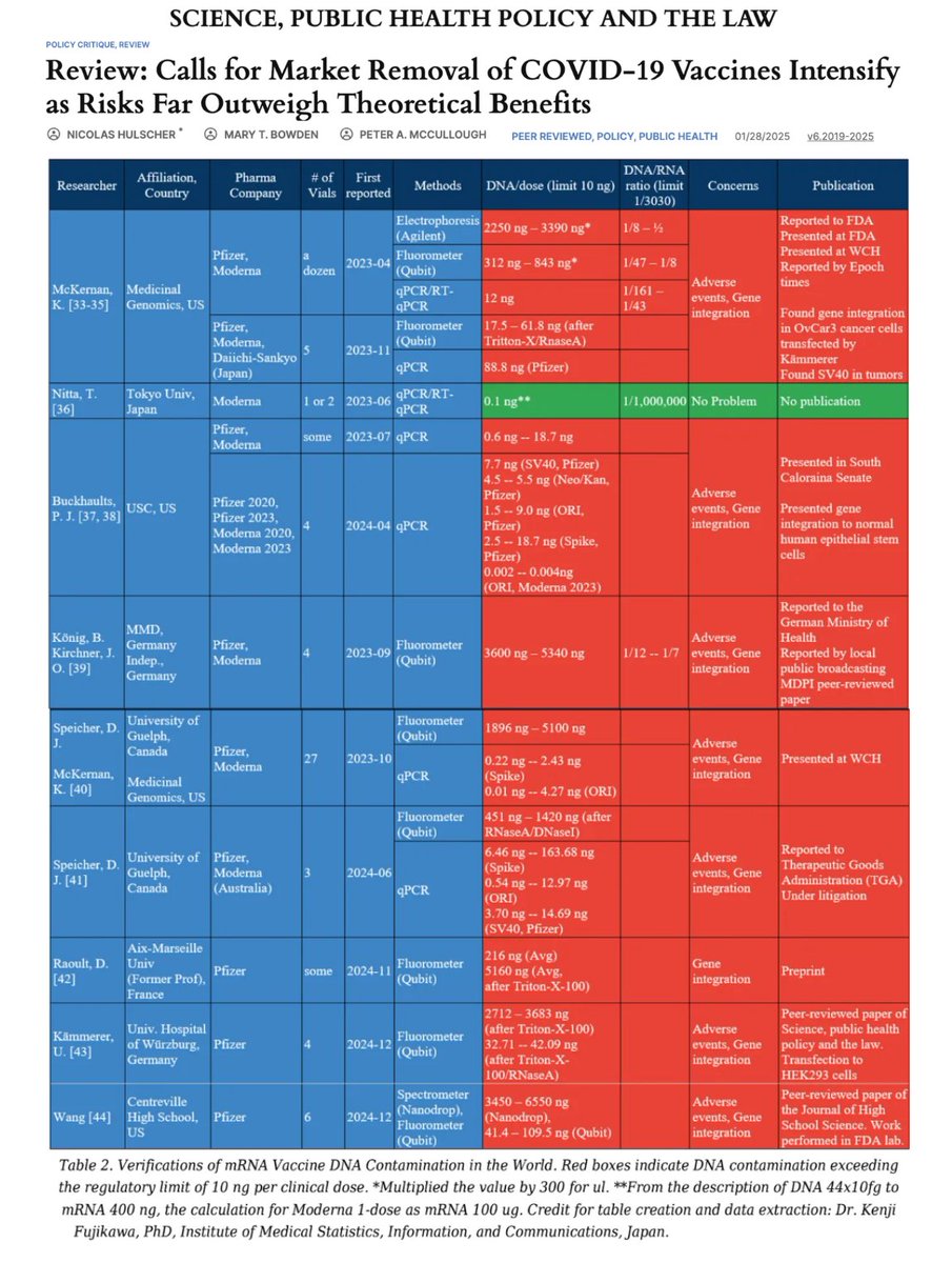 These findings corroborate 10 other independent reports worldwide documenting dangerous DNA contamination in Pfizer/Moderna shots — as systematically reviewed in our paper: https://publichealthpolicyjournal.com/review-of-calls-for-market-removal-of-covid-19-vaccines-intensify-risks-far-outweigh-theoretical-benefits/