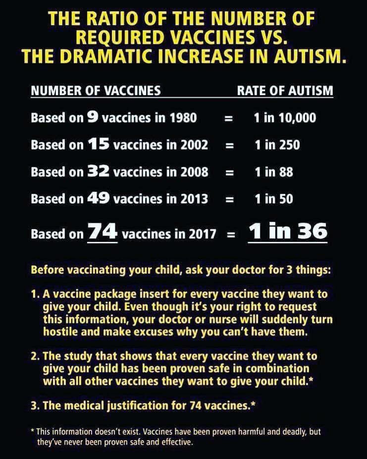 🤔Before Vaccinating your child ask your doctor 3 things: 1. A vaccine package insert for every vaccine they want to give your child. Even though it’s your right to request this information, your doctor or nurse will suddenly turn hostile and make excuses why you can’t have them. 2. The study that shows every vaccine they want to give your child has been proven safe in combination with all other vaccines they want to give your child. 3. The medical justification of 74 vaccines. ***THIS INFORMATION DOESN’T EXIST. VACCINES HAVE BEEN PROVEN HARMFUL AND DEADLY, BUT THEY HAVE NEVER BEEN PROVEN SAFE AND EFFECTIVE. Two more things, ask your pediatrician to name each Ingredient in these vaccines they are so quick to inject your child with. They can’t name them. Ask them if they would eat an apple with mercury, formaldehyde, aluminum, aborted fetal cells and other toxins in it. No, well why is it okay to inject those things directly into my child?!