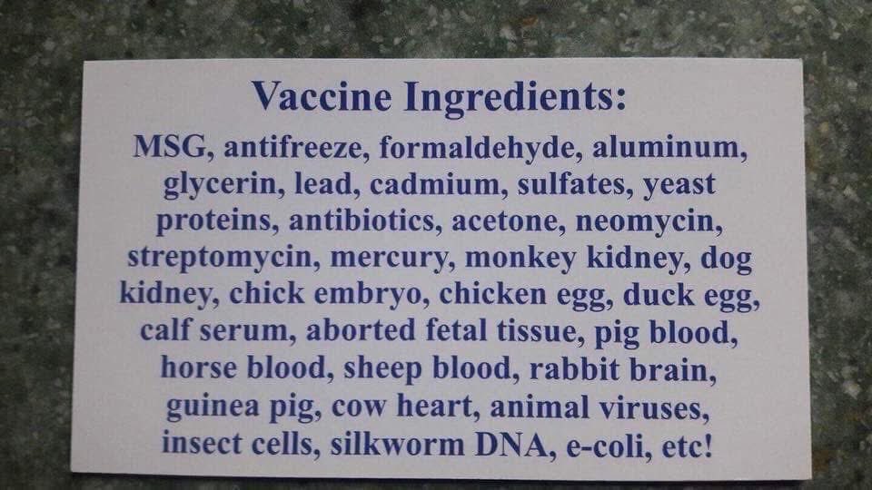 “I gathered all vaccine ingredients into a list and contacted Poison Control. After intros and such, and asking to speak with someone tenured and knowledgeable, this is the gist of that conversation. Me: My question to you is how are these ingredients categorized? As benign or poison? (I ran a few ingredients, formaldehyde, Tween 80, mercury, aluminum, phenoxyethanol, potassium phosphate, sodium phosphate, sorbitol, etc.) He: Well, that's quite a list... But I'd have to easily say that they're all toxic to humans... Used in fertilizers... Pesticides... To stop the heart... To preserve a dead body... They're registered with us in different categories, but pretty much poisons. Why? Me: If I were deliberately to feed or inject my child with these ingredients often, as a schedule, obviously I'd put my daughter in harm's way... But what would legally happen to me? He: Odd question... But you'd likely be charged with criminal negligence... perhaps with intent to kill... and of course child abuse... Your child would be taken away from you... Do you know of someone's who's doing this to their child? This is criminal... Me: An industry... These are the ingredients used in vaccines... With binding agents to make sure the body won't flush these out... To keep the antibody levels up indefinitely... The man was beside himself. He asked if I would email him all this information. He wanted to share it with his adult kids who are parents. He was horrified and felt awful he didn't know... his kids are vaccinated and they have health issues...” ~ By Iris Figueroa Here are just SOME vaccine ingredients present in routine vaccines: Formaldehyde/Formalin - Highly toxic systematic poison and carcinogen. Betapropiolactone - Toxic chemical and carcinogen. May cause death/permanant injury after very short exposure to small quantities. Corrosive chemical. Hexadecyltrimethylammonium bromide - May cause damage to the liver, cardiovascular system, and central nervous system. May cause reproductive effects and birth defects. Aluminum hydroxide, aluminum phosphate, and aluminum salts - Neurotoxin. Carries risk for long term brain inflammation/swelling, neurological disorders, autoimmune disease, Alzheimer's, dementia, and autism. It penetrates the brain where it persists indefinitely. Thimerosal (mercury) - Neurotoxin. Induces cellular damage, reduces oxidation-reduction activity, cellular degeneration, and cell death. Linked to neurological disorders, Alzheimer's, dementia, and autism. Polysorbate 80 & 20 - Trespasses the Blood-Brain Barrier and carries with it aluminum, thimerosal, and viruses; allowing it to enter the brain. Glutaraldehyde - Toxic chemical used as a disinfectant for heat sensitive medical equipment. Fetal Bovine Serum - Harvested from bovine (cow) fetuses taken from pregnant cows before slaughter. Human Diploid Fibroblast Cells - aborted fetal cells. Foreign DNA has the ability to interact with our own. African Green Monkey Kidney Cells - Can carry the SV-40 cancer-causing virus that has already tainted about 30 million Americans. Acetone - Can cause kidney, liver, and nerve damage. E.Coli - Yes, you read that right. DNA from porcine (pig) Circovirus type-1 Human embryonic lung cell cultures (from aborted fetuses) You can view all of these ingredients on the CDCs website Here : https://cdc.gov/vaccines/pubs/pinkbook/downloads/appendices/b/excipient-table-2.pdf Also, thank you to our dear colleague, Dr. david Cartland for this tweet. Did Twitter allow me to post this? It sure did, but the last regime tried to suppress this information.