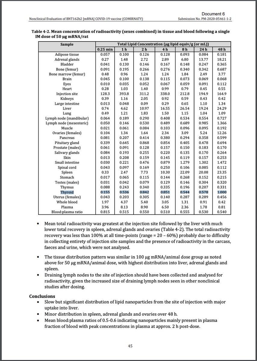 Video of how Pfizer's "Pesky lipid nano particles" bio distribute. NEW: Dr John Campbell covers a clip by @InsidemRNAFilm, showing the size of lipid nano particles and how they bio-distribute in the body. I've attached Pfizer's Bio-distribution report below showing how this video meets Pfizer's own data. Pfizer said at the last ACIP meeting: "Our bio distribution studies were done [in] consultation with the FDA [and also that] we did work in close consultation with the FDA on all our bio distribution studies" (Direct quotes from Pfizer). So when thinking about the video attached and seeing how the lipid nano particles are distributed "Everywhere and Anywhere", remember they also contain within them DNA contamination verified by peer reviewed evidence (Speicher et al). Here's a list of where they go 48 hours after injection: 1. Liver - 24.29 2. Spleen - 23.35 3. Adrenal Glands - 18.21 4. Ovaries - 12.26 5. Bone Marrow - 3.77 6. Small Intestine - 1.472 7. Lymph Node (mesenteric) - 1.366 8. Large intestine - 1.34 9. Lung - 1.09 10. Thyroid - 1.00 11. Lymph node (mandibular) - 0.727 12. Pituitary gland - 0.694 13. Bone (femur) - 0.687 14. Pancreas - 0.599 15. Heart 0.55 16. Uterus - 0.456 17. Kidneys - 0.42 18. Bladder - 0.365 19. Thymus - 0.331 20. Testes (males) - 0.320 21. Salivary glands - 0.264 22. Skin - 0.253 23. Stomach - 0.215 24. Muscle - 0.192 25. Adipose tissue - 0.181 26. Prostate (males) - 0.170 27. Eyes - 0.112 28. Spinal cord - 0.112 29. Brain - 0.068 The below document is Pfizer's own document which required a FOI request. The FDA worked with Pfizer on it. The peer reviewed study (Speicher, McKernan, Rose) showed that DNA contamination "exceeded the regulatory limit for residual DNA set by the US FDA and the WHO by 36–153-fold for Pfizer and 112–627-fold for Moderna" Bookmark this for reference.