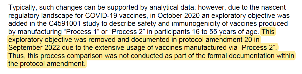 See this thread for a further update showing that Pfizer/BioNTech never did the planned study comparing process 2 v 1 for safety and immunogenicity: https://x.com/joshg99/status/1705177305499279525