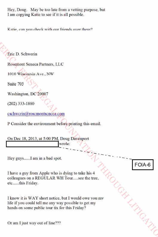 /10 On December 18, 2013, lobbyist Doug Davenport reached out to Hunter’s business partner, Eric Schwerin, for last-minute tickets for a Christmas White House tour for his “guy from Apple.” Even those familiar with Rosemont Seneca knew that they had unmatched access to the Obama-Biden White House.