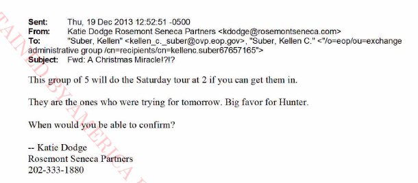 /13 Rosemont Seneca then directly contacted the Office of the Vice President to confirm the last-minute Christmas tour as a “Big favor for Hunter,” indicating that Hunter was using his access to the White House to benefit those involved with Rosemont Seneca.