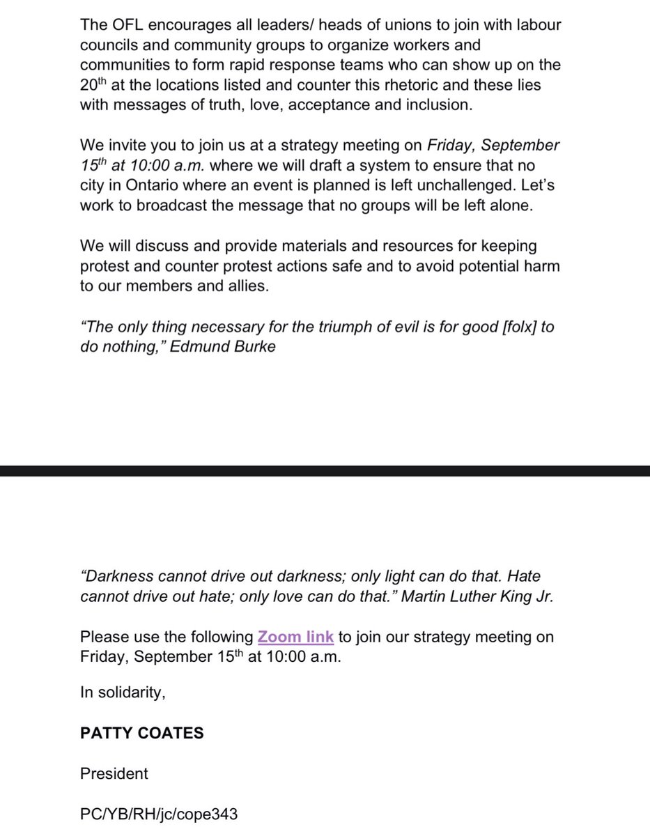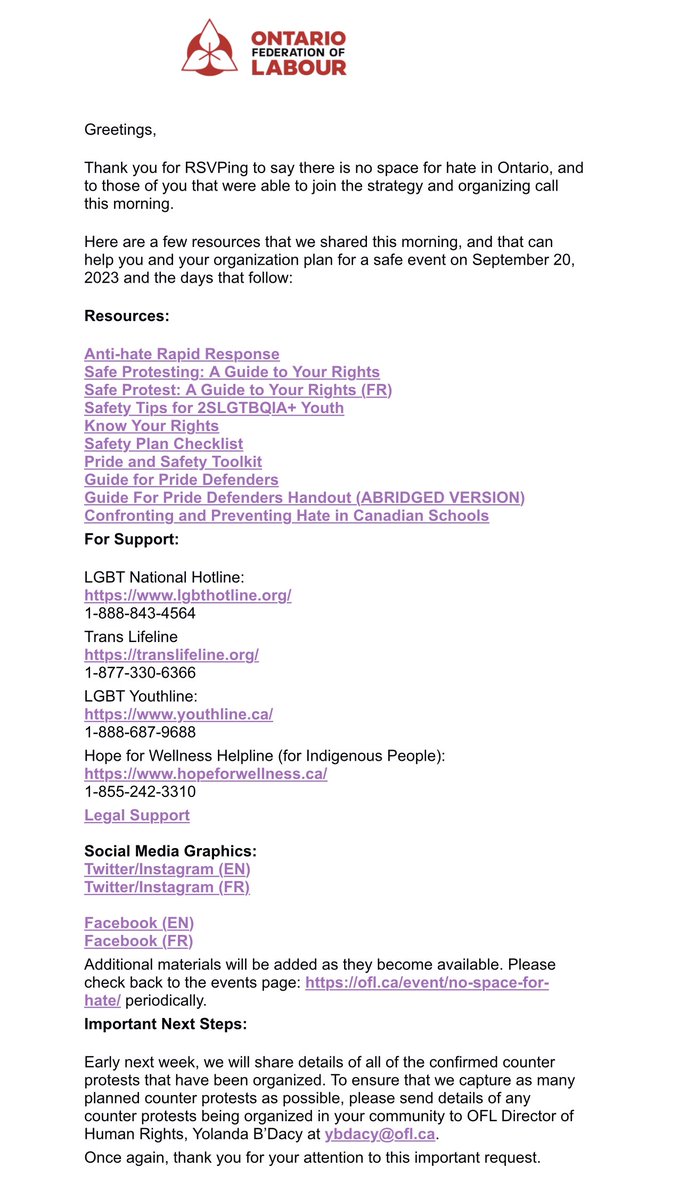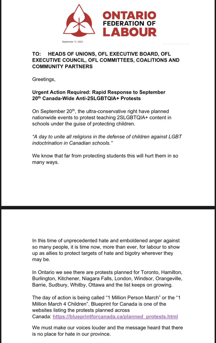 Here is the Ontario Federation of Labour’s email to members, helping them organize counter-protests for the various marches across Canada on the 20th, and my school protest in Toronto on September 22nd.