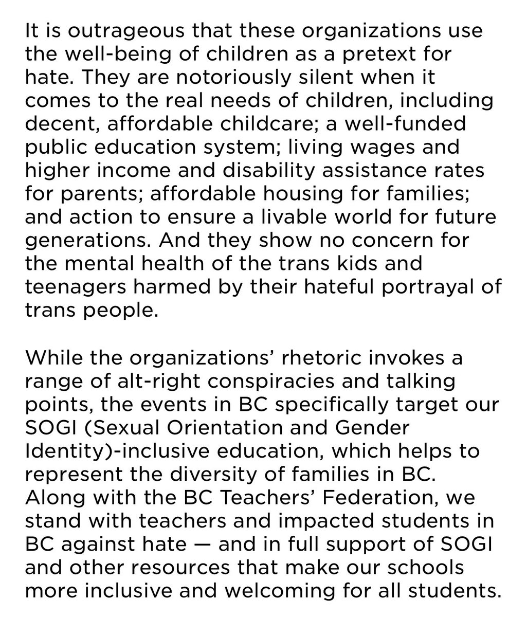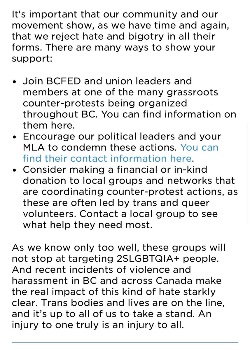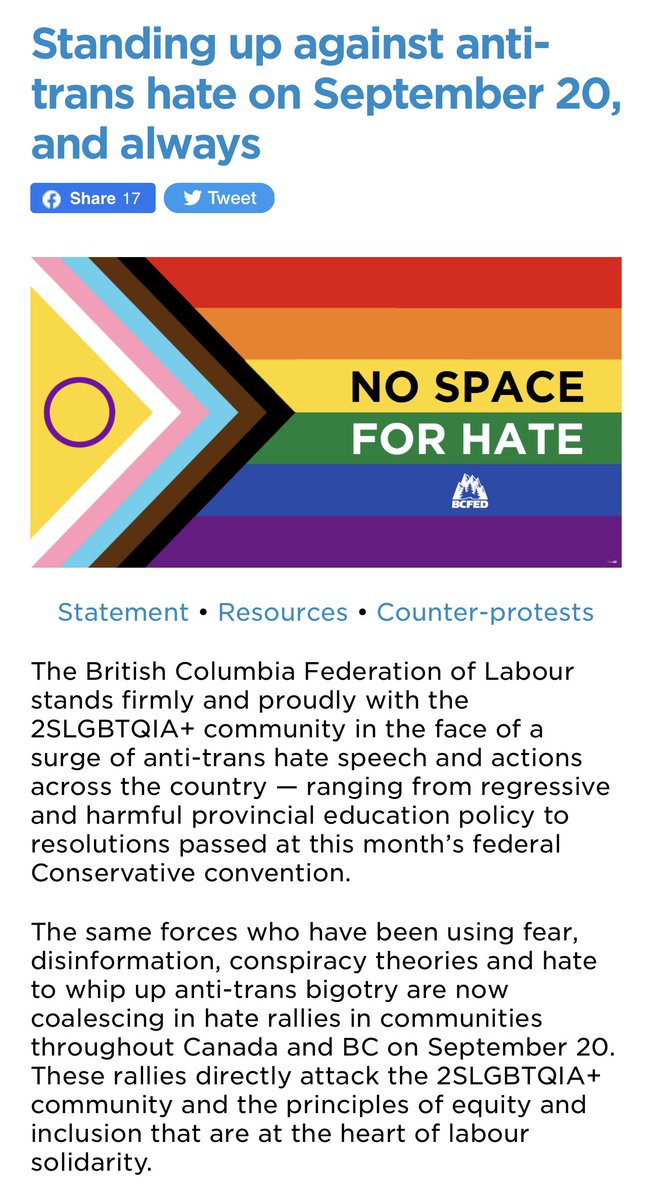 In light of anti-trans events across Canada taking place today, Canada's Unions re-affirm our support for the 2SLGBTQI+ community. The increased hate and division facing trans people in schools and communities must end. #WorkersUnitedAgainstHate