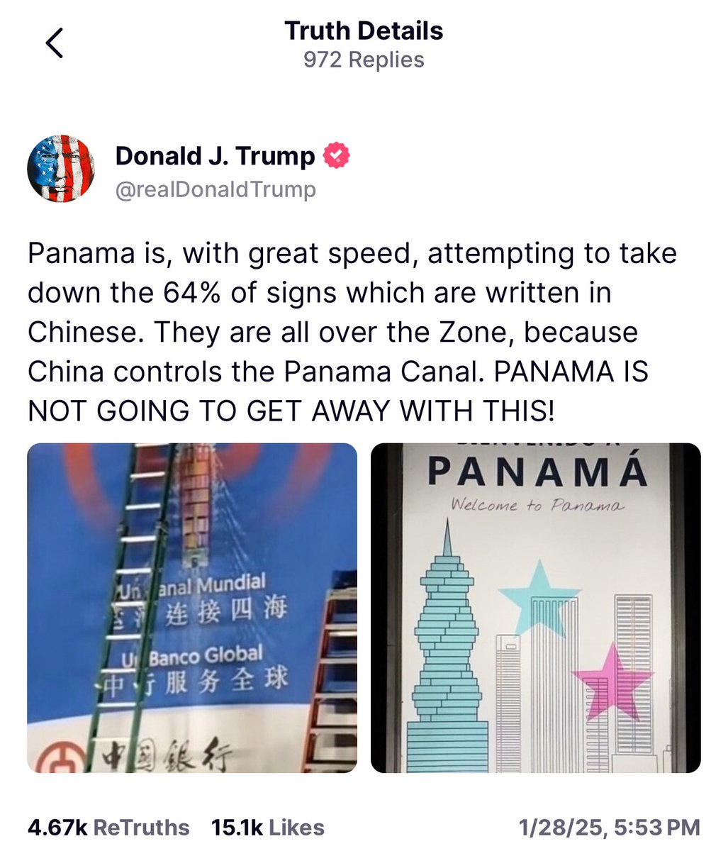 Great to see President Trump calling out the Chinese signs that are all over Panama. I’ve been reporting on these signs for a while! Looks like the CCP is trying to cover up their grip over Panama. President Trump will take back the Panama canal. https://t.co/N40F79pjsb