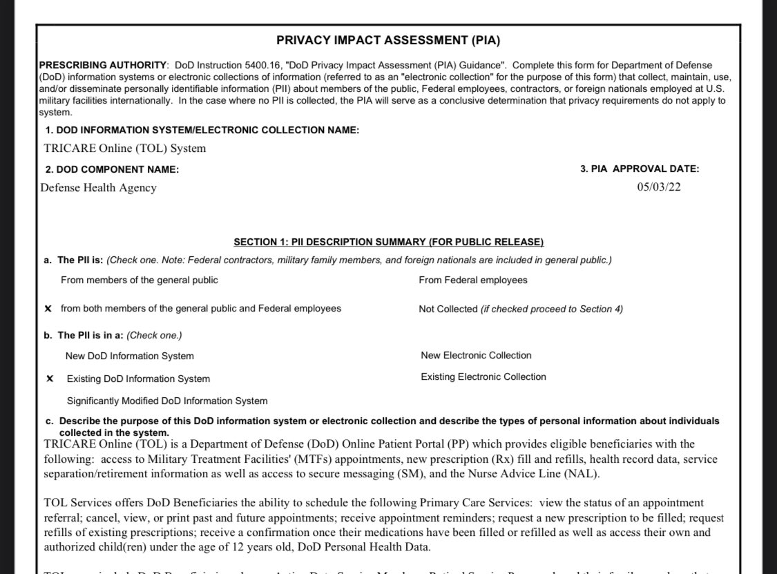 Major update to the story I broke about the @USNavy telling sailors they can’t access their kids medical records online if they’re 12 or older and that they discuss gender identity, sexual orientation and sex privately with service member’s kids. We all hoped this was one crazed Lt. Commander but I got my hands on some documents that confirm at least part of this is policy for all branches. See the bottom paragraph of this "Privacy Impact Statement" from the Defense Health Agency where they say you can only access DOD Personal Health Data for authorized Children under 12 years old. The second image is from TriCare, the healthcare program for service members. This image shows you can only access extremely limited health info on your 12-17 year old children and it omits the controversial + sexual topics that the Navy rep in the video I released said they hide from parents.