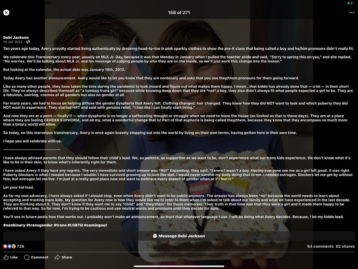 Debi Jackson felt persecuted for following the expert opinion to transition her son. She went from a skeptic to a true believer. As her son began to change & grow out of his ‘girly’ behaviors, his mom had already committed fully to his transition. 14 https://t.co/isLu2Dpczz