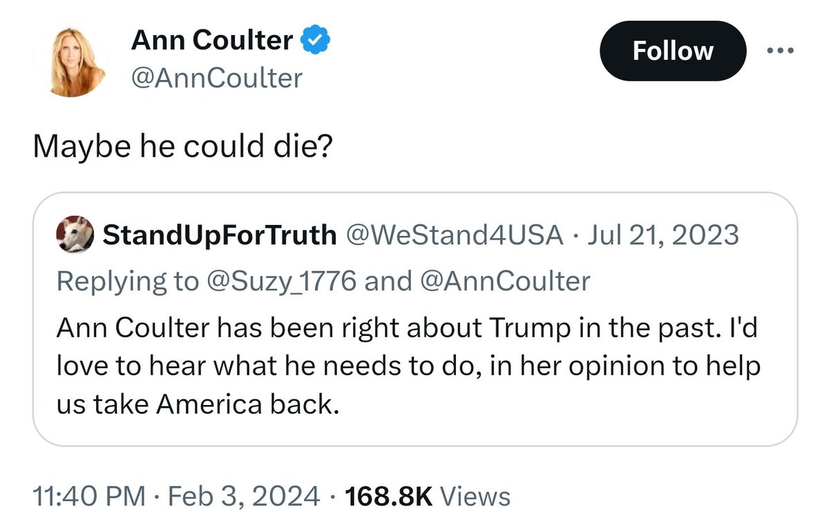 Yesterday Alex Jones fantasized about Trump getting assassinated, today Ann Coulter wishes death on Trump. https://t.co/a7diY5VYkf