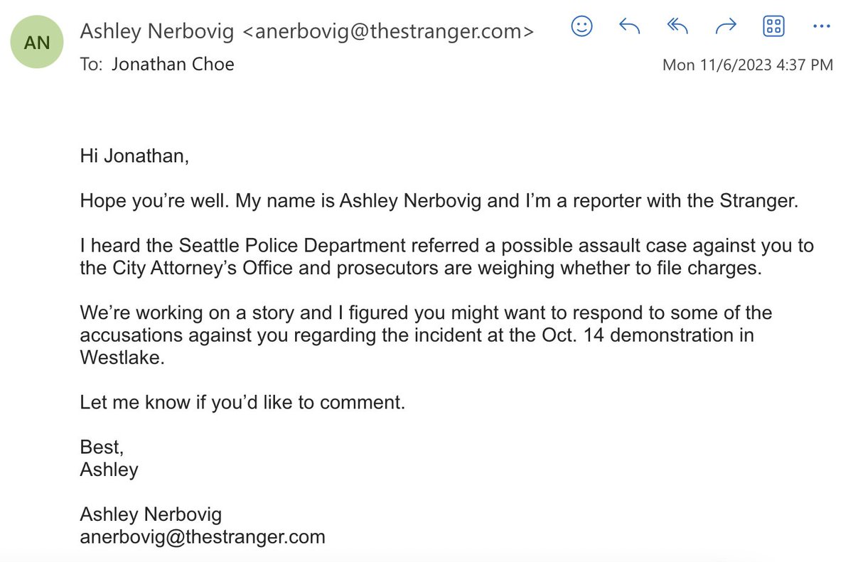 This appears to be part of a coordinated effort to try and stop Choe from reporting. Except so far The Stranger is the only one interested in the story of an unhinged pro-Hamas/Antifa activist who is mad Choe covers their rallies for terrorists