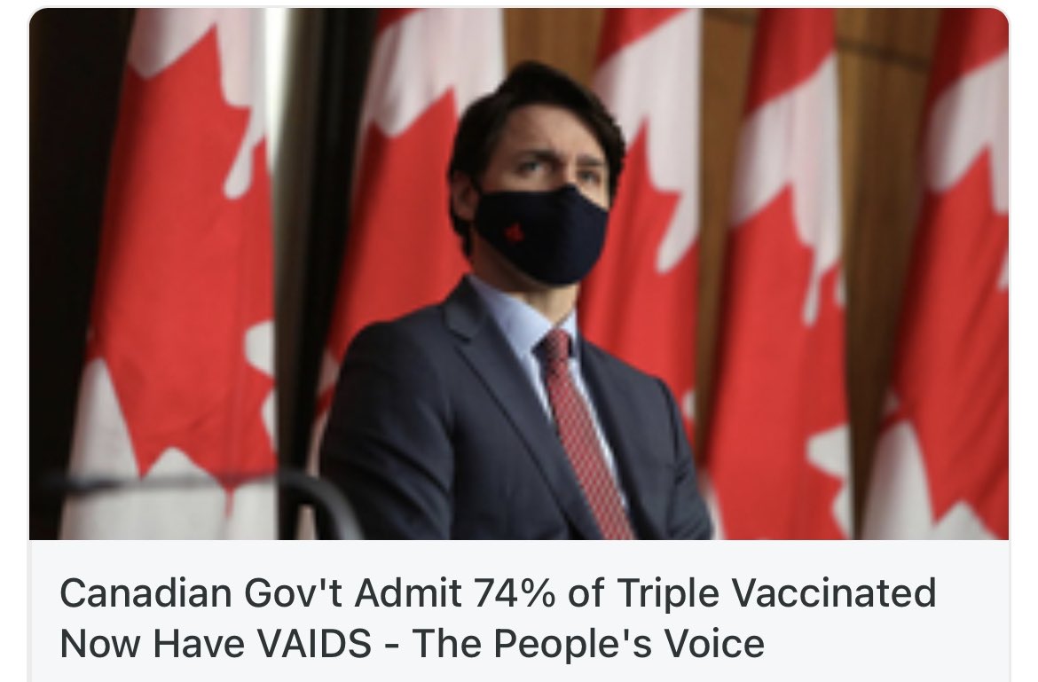 Canadian Gov’t Admit 74% of Triple Vaccinated Now Have VAIDS. In startling new information coming to light many people who got the #mRNA vaccine in Canada are now finding out that their immune systems have been severely damaged. I guess what World Economic Forum disciple #Trudeau told you wasn't true. Do you still support him? Read here #VaccineInjuries #ExcessDeaths #WEF2030Agenda https://thepeoplesvoice.tv/canadian-govt-admit-74-of-triple-vaccinated-now-have-vaids/