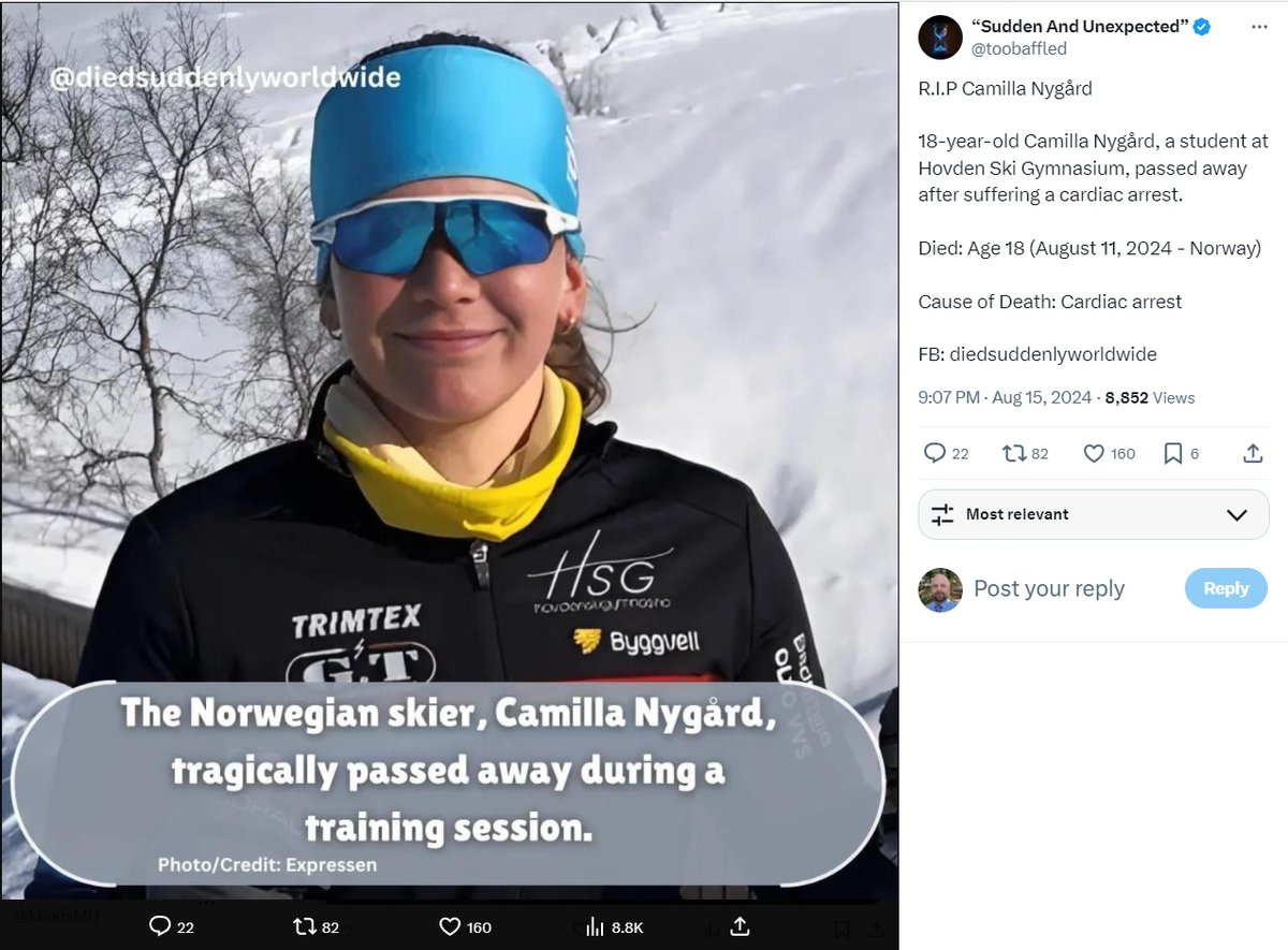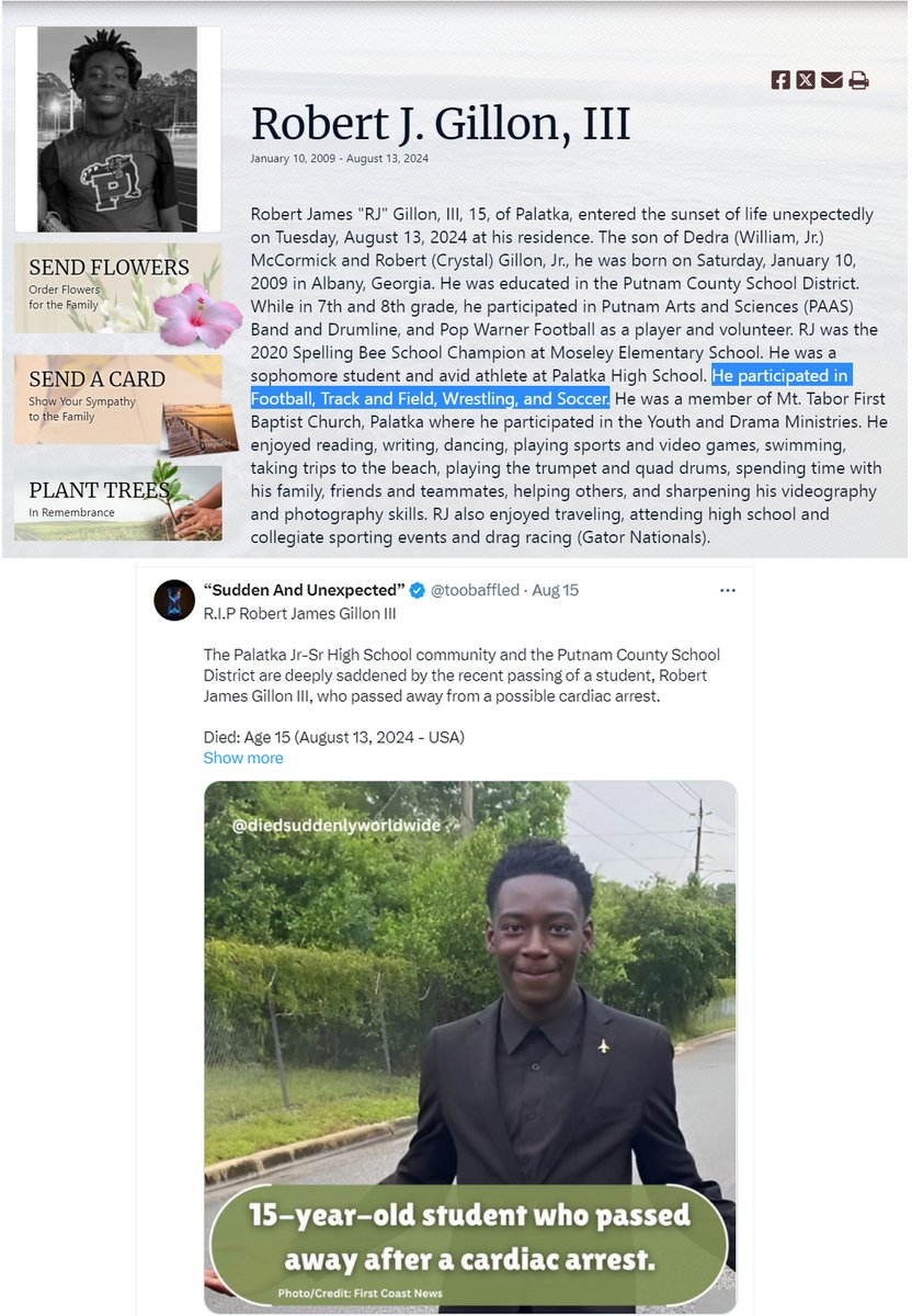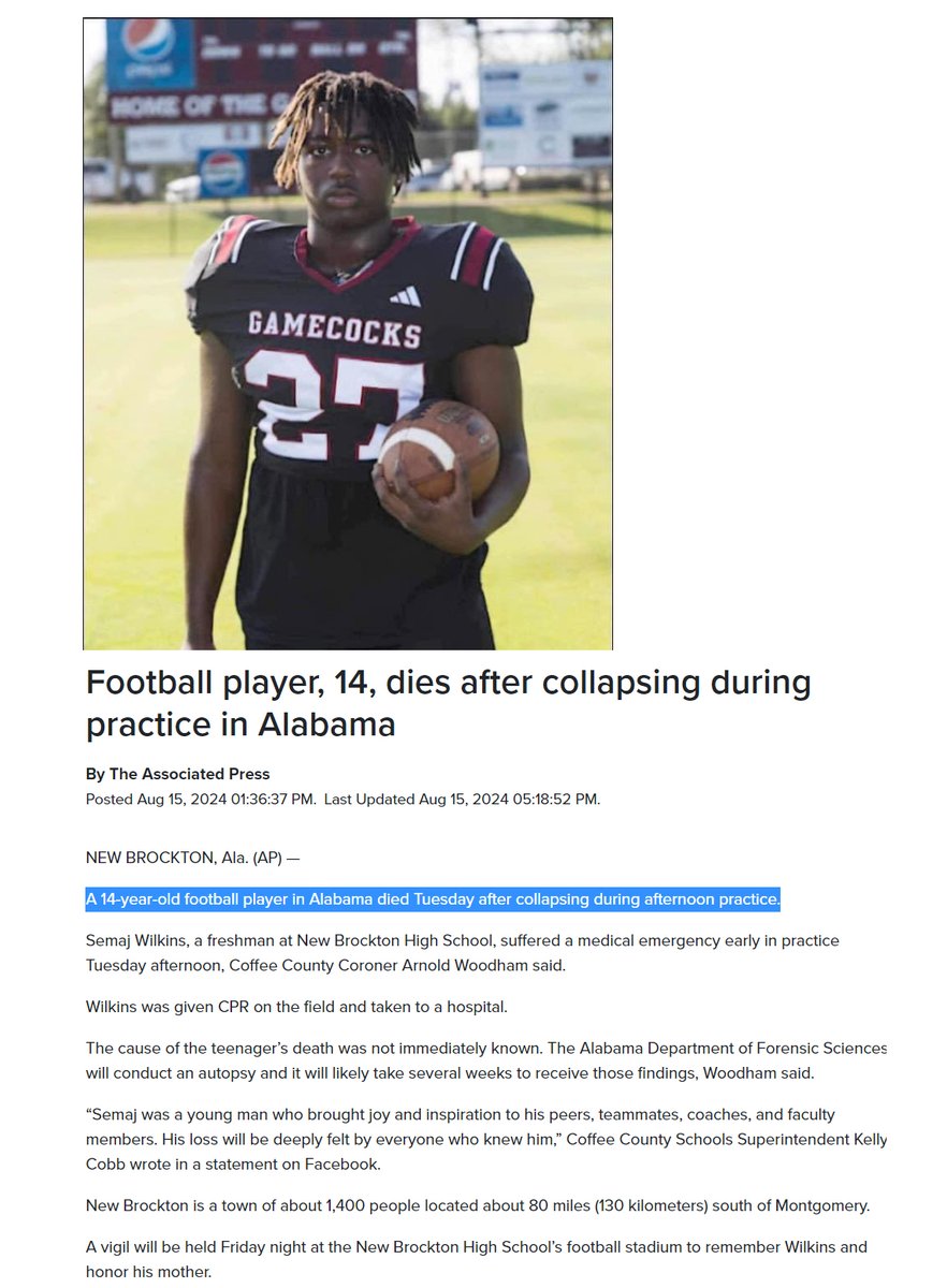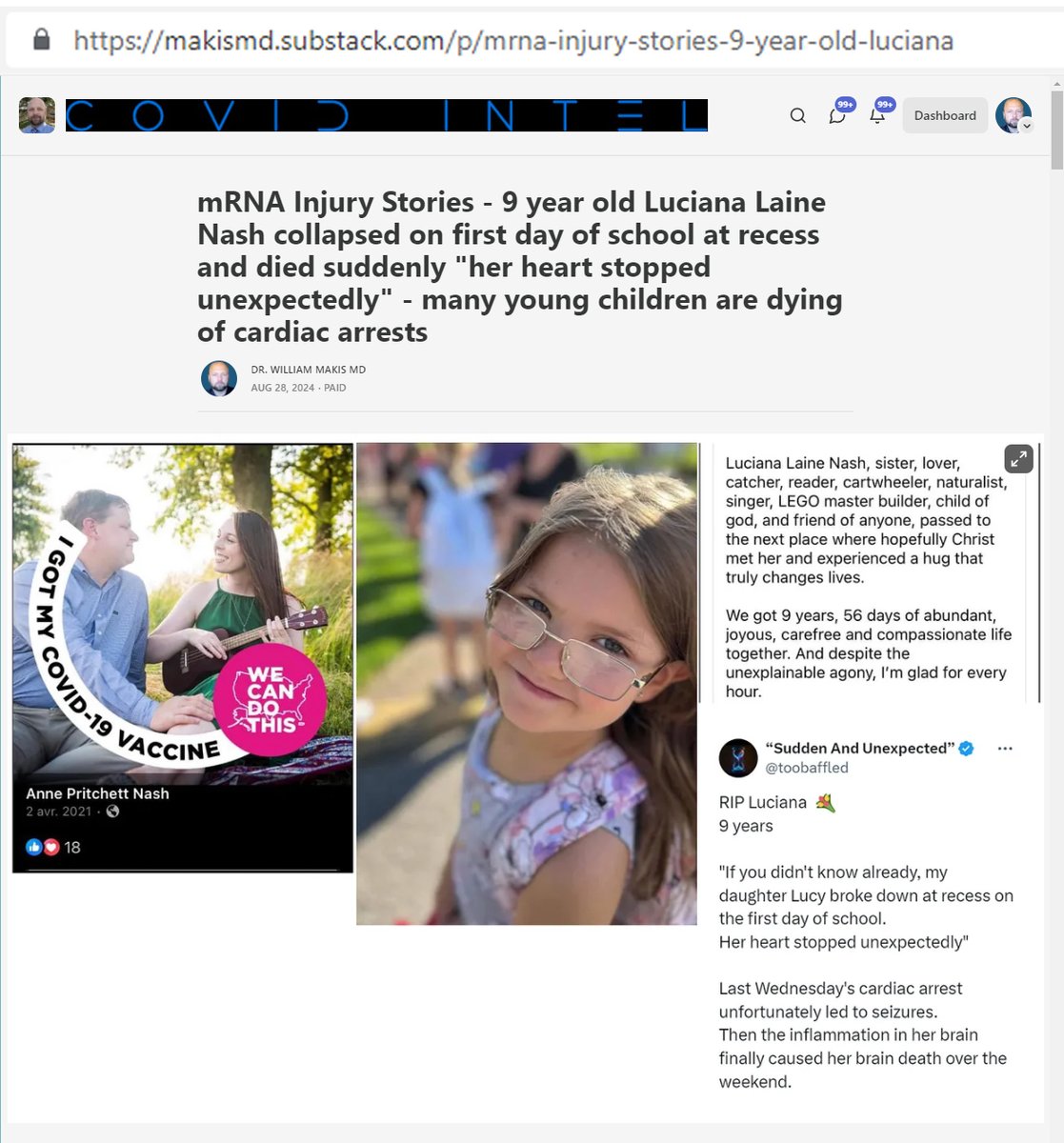 NEW ARTICLE: Nine year old Luciana Laine Nash collapsed on first day of school at recess and died suddenly - "her heart stopped unexpectedly" - many young children are dying of cardiac arrests Hundreds of children have died after taking Pfizer or Moderna COVID-19 mRNA Vaccines in Canada. Thousands have died globally. Luciana's mom was very enthusiastic about COVID-19 Vaccines. In April 2021 she proudly posted on facebook: "I got my COVID-19 Vaccine". Some brainwashed moms who were victims of disinformation and propaganda, rushed to get their small children COVID-19 Vaccinated. Her 9 her old daughter, Luciana, dropped dead on the first day of school 2024. Cardiac arrest. Then seizures. Then brain inflammation. Then death. She died on Aug.13, 2024 at Riley Hospital for Children in Indianapolis. She had no risk from COVID-19. Aug.5, 2024 - Hopewell, Virginia - 15 year old football player Jayvion Taylor collapsed during football practice on August 5, 2024 and died suddenly. "the student collapsed about 10 feet from a coach. Two coaches were in the vicinity and immediately performed CPR and called 911...AED was used". Aug.11, 2024 - 18 year old Camilla Nygard, a Norwegian skier, died during a training session, from cardiac arrest Aug.13, 2024 - Palatka, FL - 15 year old athlete Robert James Gillon III died suddenly at home from a suspected cardiac arrest Aug.13, 2024 New Brockton, AL - 14 year old football player Semaj Wilkins, suffered a medical emergency early in football practice and died on Aug.13, 2024. This will keep happening because parents never spoke up when they should have. Here in Alberta, on June 17, 2024, @AlbertaUCP sponsored an event called "An Injection of Truth", hosted by @EricBouchardAB, where I presented on the 538 child deaths in VAERS after Pfizer or Moderna COVID-19 mRNA Vaccination. Since then, Alberta Minister of Health @AdrianaLaGrange has publicly come out against protecting Alberta's children and in support of those who abuse, assault or traffick children. And Alberta Premier @ABDanielleSmith said she wants parents to have the choice to inject their kids with a toxic substance and without informed consent, while doctors remain illegally muzzled and under attack by the College of Physicians and Surgeons of Alberta @CPSA_CA. For speaking up for children, the College sent @EdmontonPolice to my house on Sunday afternoon on Aug.4, 2024 as a show of force and intimidation Children continue to be under attack in Canada and the US and the abusers of children continue to get protection from Institutions and governments. Article Link in photo to avoid shadowban, just re-type the URL in the 1st photo at the top, into your browser to access @TuckerCarlson @JoeRogan #DiedSuddenly
