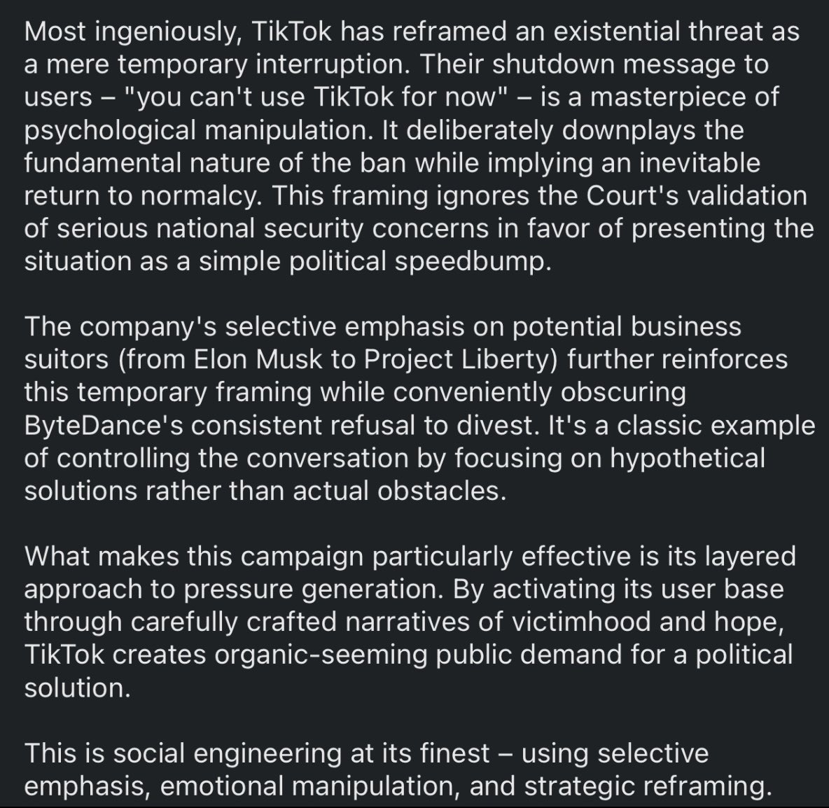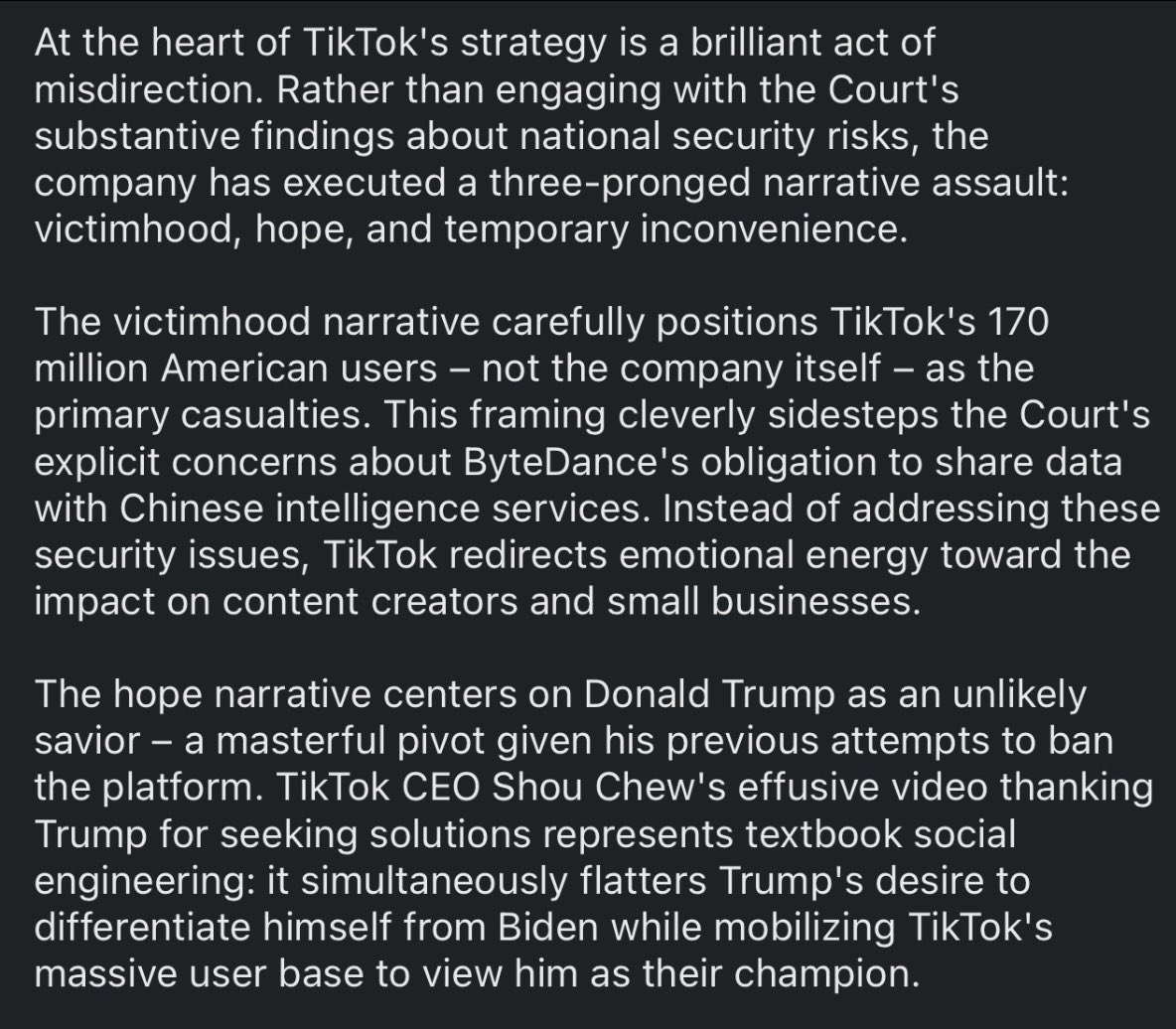 A buddy of mine in the intelligence community just sent me this, and it’s a good read. Stop being useful idiots for the CCP and wake up and realize your fuckin TikTok shop isn’t as important as our national security. https://t.co/0kKsYpmHRO
