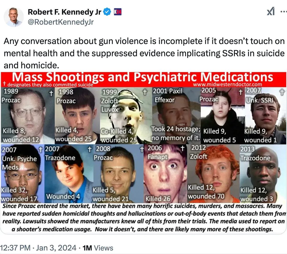 Big Pharma gaslit the world for decades. They said SSRIs are the silver bullet. They said they didn’t cause psychotic violence. Mentally ill people were just already dangerous. midwesterndoctor.com/p/the-evidence…
