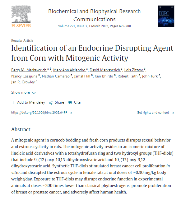 In 2002, researchers identified a novel substance in corn (a tetrohydrofuran-diol) that rendered female mice infertile and also caused the proliferation of prostate cancer and breast cancer cells. They discovered that it worked independently of the body's estrogen receptors. https://t.co/91Dxw0341n