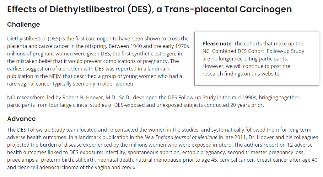 DES was an estrogenic substance that was administered freely for morning sickness and other female hormonal problems, until it was discovered that it was heavily linked to cancer, miscarriage, stillbirths and a range of other serious negative effects.