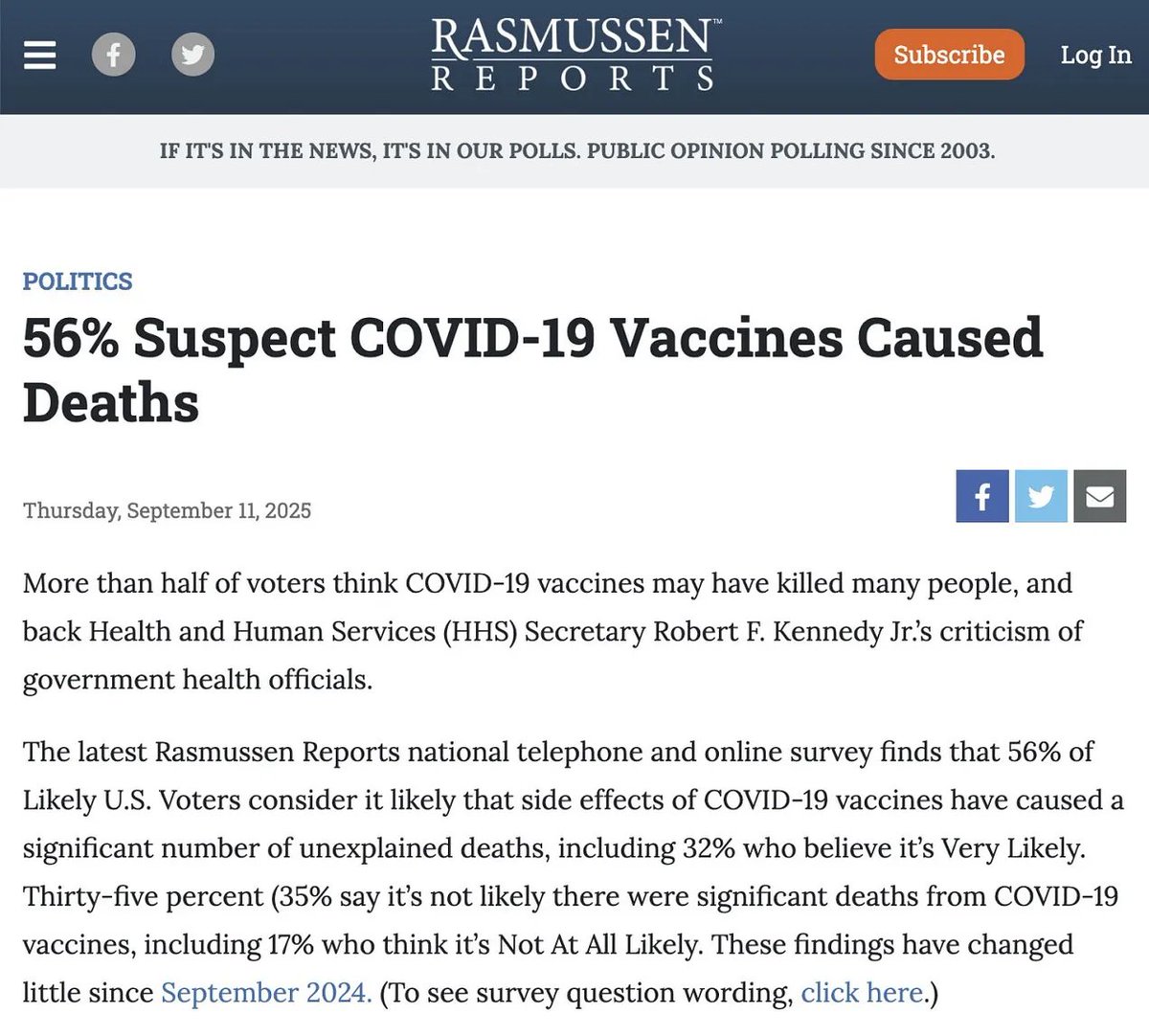 @MidwesternDoc Polls now show 56% of American voters believe COVID vaccines caused mass deaths. Distrust is growing. The public knows what PR can’t erase: too many were harmed to deny it anymore. This is why hearings, books, and whistleblowers are gaining traction fast.