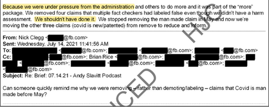 Other documents confirm this. In July 2021, Clegg asked why Facebook had been censoring the lab leak theory of COVID-19’s origins. The answer could not have been clearer: “Because we were under pressure from the administration . . . We shouldn’t have done it.” https://t.co/InrXBDXYVL