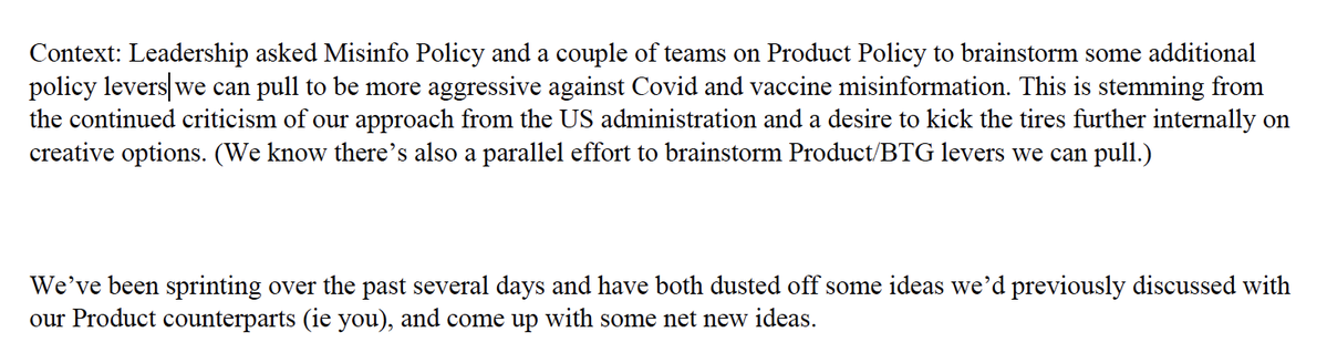 August 2, 2021: “[Facebook’s] Leadership asked Misinfo Policy . . . to brainstorm some additional policy levers we can pull to be more aggressive against . . . misinformation. This is stemming from the continued criticism of our approach from the [Biden] administration.”