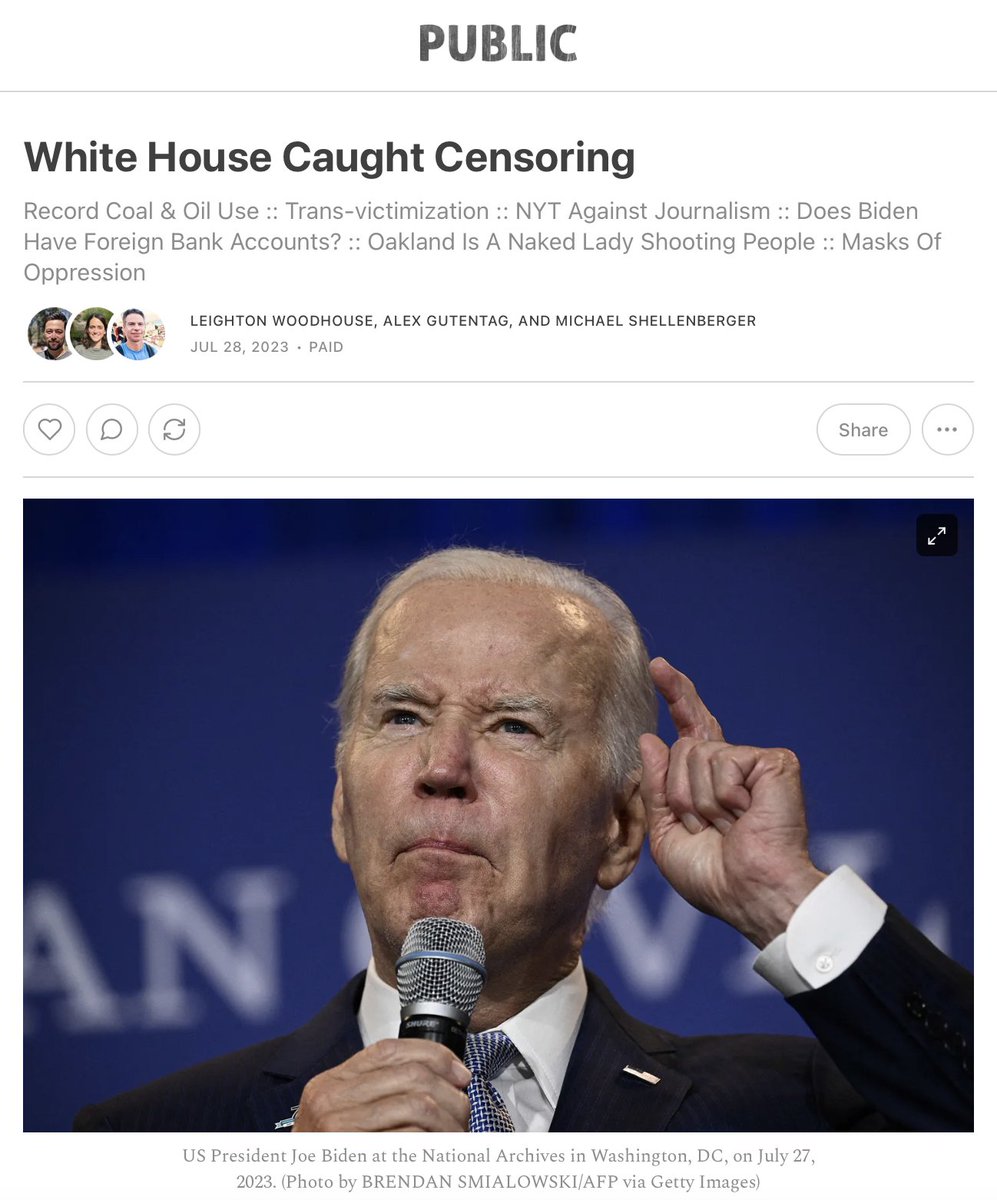 White House Caught Censoring Record Coal & Oil Use :: Trans-victimization :: NYT Against Journalism :: Does Biden Have Foreign Bank Accounts? :: Oakland Is A Naked Lady Shooting People :: Masks Of Oppression by @lwoodhouse@galexybrane@kshellenberger White House Caught Censoring For months, mainstream journalists and Democrats have insisted that nobody in the White House was demanding censorship of anybody. They were just “flagging content” and using their own right to free speech to point out “mis- and disinformation.” But now, newly released emails show that the Biden White House demanded more censorship by Facebook of accurate information about vaccines and Covid’s origin. “Can someone quickly remind me why we were removing — rather than demoting/labeling — claims that Covid is man made,” asked Nick Clegg, Facebook’s president of global affairs, in a July 2021 email to his coworkers. Answered a Facebook Vice President in charge of censorship: “We were under pressure from the administration and others to do more. We shouldn’t have done it.” We already knew that Facebook, under White House pressure, censored "often-true content,” in the words of one company executive, even though it "does not contain actionable misinformation" because it was "discouraging vaccines." But the new emails released yesterday by Rep. Jim Jordan, chair of the House Subcommittee on the Weaponization of Government, and first reported this morningby the Wall Street Journal, are even more damning. In April of 2021, another Facebook executive emailed CEO Mark Zuckerberg and COO Sheryl Sandberg to say, “We are facing continued pressure from external stakeholders,” the person wrote, including the [Biden] White House and the press, to remove more COVID-19 vaccine discouraging content.” Lest there be any doubt about White House pressure, the Facebook Vice President said, “There is likely a significant gap between what the WH would like us to remove and what we are comfortable removing.” The White House even demanded that Facebook take down jokes. “The WH has previously indicated that it thinks humor should be removed if it is premised on the vaccine having side effects, so we expect it would similarly want to see humor about vaccine hesitancy removed,” said the same Facebook vice president. “I can’t see Mark in a million years being comfortable with removing that—and I wouldn’t recommend it,” wrote Clegg. This kind of thing will keep happening until Congress takes action. Happily, that’s what Rep. Dan Bishop, who recorded a podcast with Public a few weeks back, proposed to do this week. Bishop, and Reps. Matt Gaetz, Andy Biggs, Harriet Hageman, and others introduced The Censorship Accountability Act, which would allow people to sue executive branch employees caught demanding social media companies to censor. Given that journalists and Democrats insist that such a thing never occurs, surely we can expect to see them championing the legislation. Right? — MS https://wsj.com/articles/facebook-bowed-to-white-house-pressure-removed-covid-posts-2df436b7