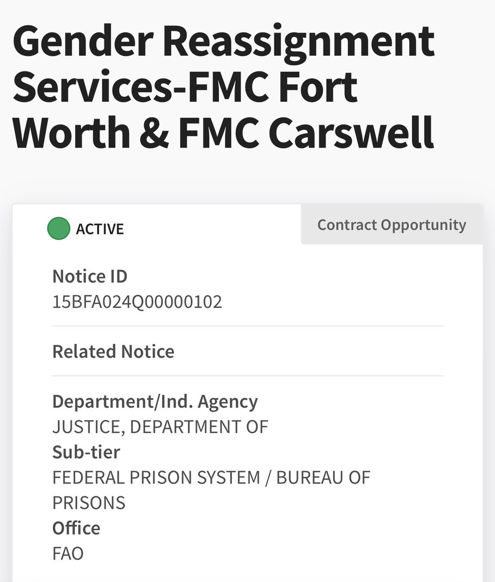 The Federal Bureau of Prisons has a $17M contract out for “gender reassignment surgery medical services” for 2 locations in Texas. Our tax dollars are funding the medical transition of mentally ill criminals. https://t.co/o3rNIZ4fVY