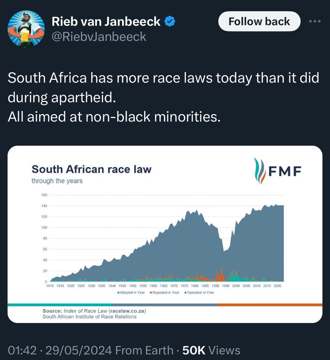 While we don’t like admitting it, America is in a similar position and is seeing similar results; @realJeremyCarl does a great job documenting this in his “The Unprotected Class” We, like South Africa, have a great many anti-white laws that are leading to similar outcomes