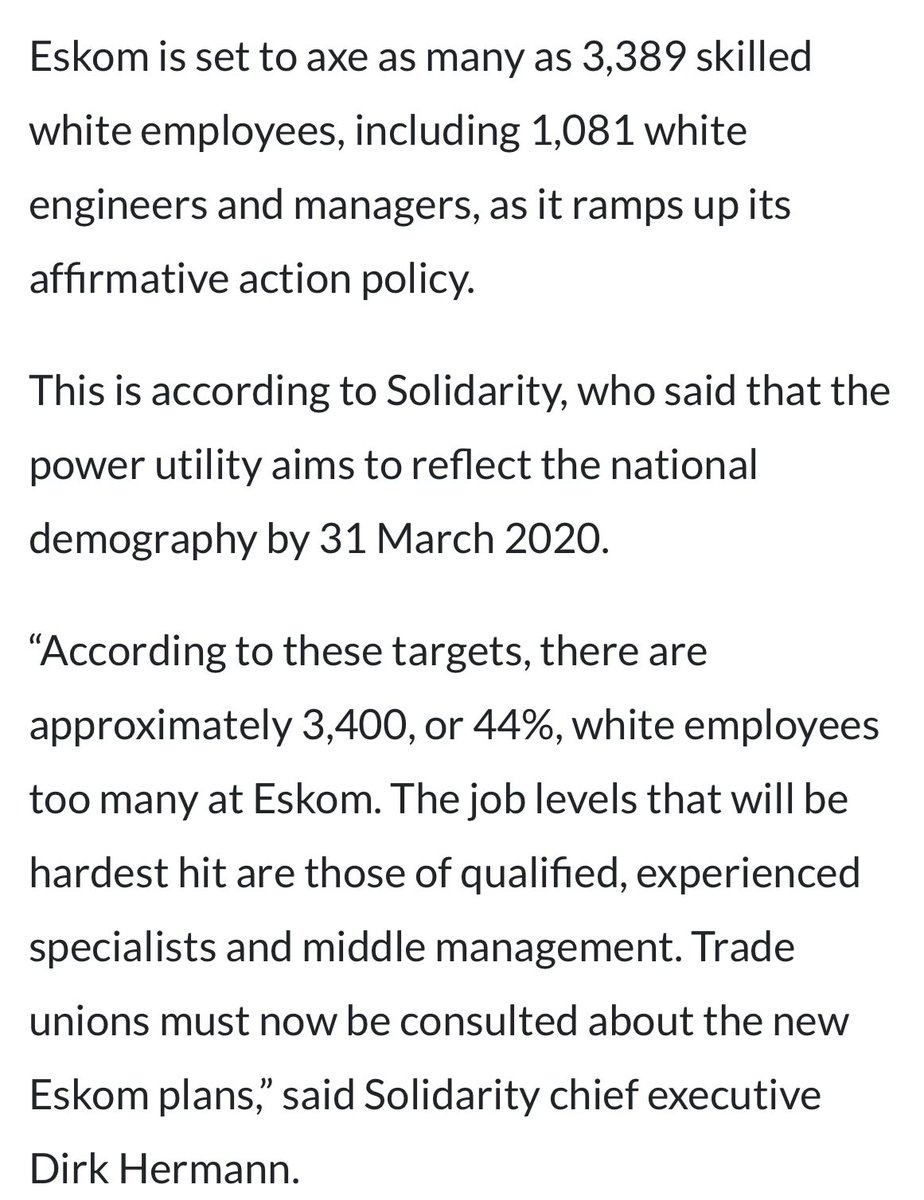 This leads to obscene, country destroying distortions Not least of which, it effectively means that it is impossible to hire white workers, as at only ~7% of the population, quota-based hiring and promotion means only a few can ever be hired This can even lead to job cuts to meet quotas: electric utility Eskom, known mainly for constant rolling blackouts, was considering firing thousands of its experienced white engineers to meet racial quotas