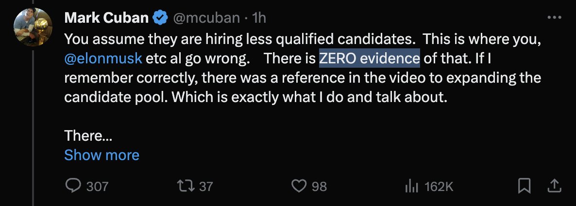The false claim that @mcuban and other demographic engineers in the DEI cabal pedal is that there is "zero evidence" that DEI entails selecting "less qualified candidates." They say this despite the extensive evidence that exists from Affirmative Action cases that indicates that DEI does, in fact, mean less qualified candidates get a leg up on the basis of their group identity while others are effectively handicapped. The question that these people owe us an answer to is a simple one: Why should an individual have a better or worse chance of obtaining a position on the basis of their group identity? I suspect they will continue to dodge answering this question directly and instead continue to obfuscate the issue to their followers. That said, if Cuban and others are genuinely unaware and change their stance after seeing the data then they will have my respect. The ball is in your court @mcuban