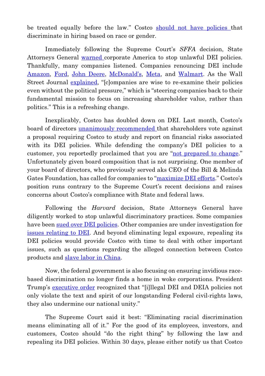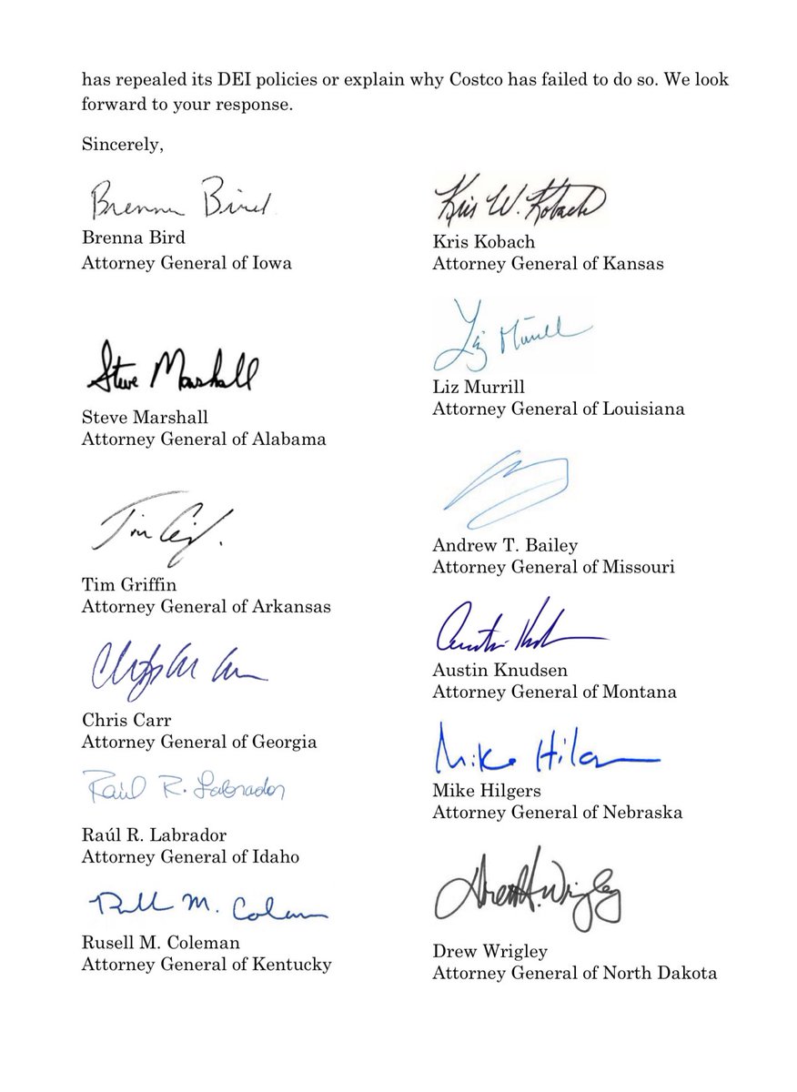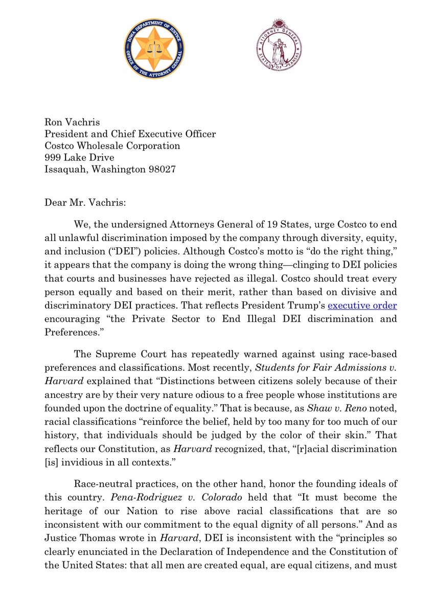 BREAKING: 19 Attorney General’s just sent a letter to Costco warning that DEI policies are illegal when they discriminate based on race. The 19 state AG’s also demand that Costco communicates if they’ll drop DEI within 30 days or explain why they’re keeping DEI. We will win. 🔥 https://t.co/CFJH3INVDf