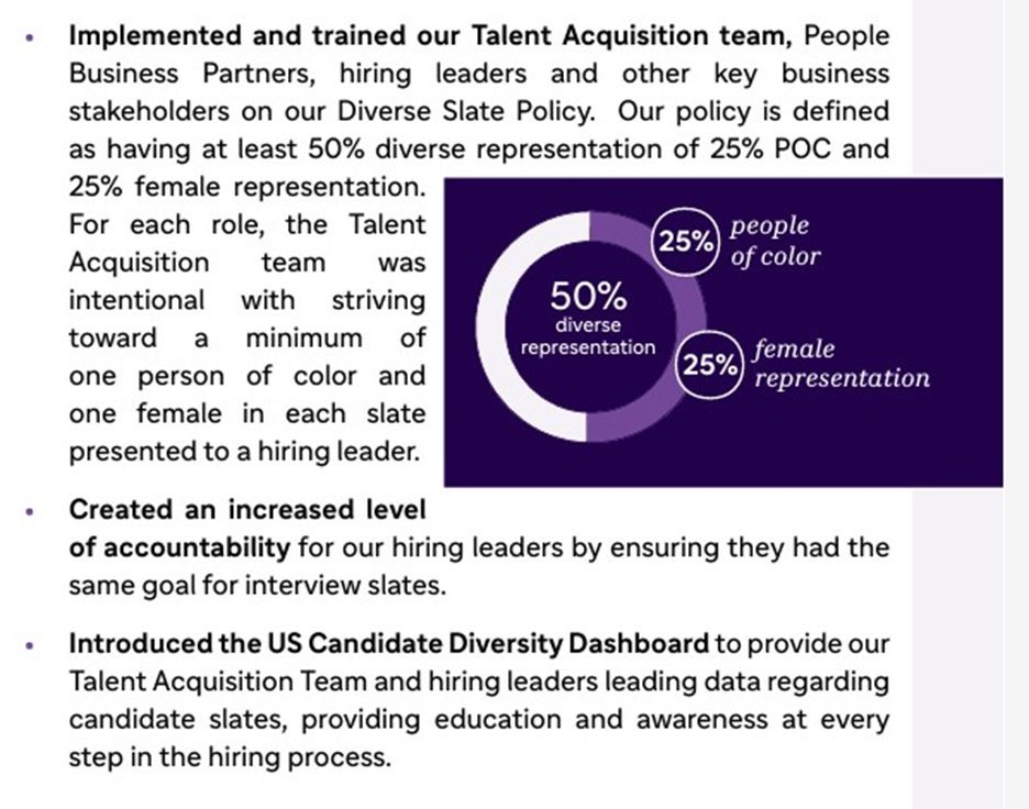 /2 We just filed a federal civil rights complaint against French pharma company, Sanofi. The evidence strongly suggests Sanofi’s management has created a culture of systemic racism. Sanofi’s “Diverse Slate Policy” requires the “Talent Acquisition team” for each role to present “a minimum of one person of color and one female in each slate presented to a hiring leader” to achieve “at least 50% diverse representation of 25% POC and 25% female representation.”