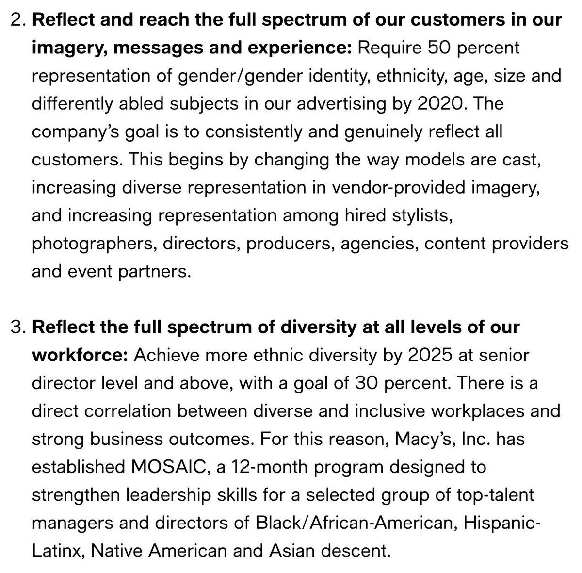 /3 We filed another civil rights complaint against Macy’s. Macy’s has a plan that explicitly instructs management to “[a]chieve more ethnic diversity by 2025 at senior director level and above, with a goal of 30 percent,” as well as to initiate a “12-month program designed to strengthen leadership skills for a selected group of top-talent managers and directors of Black/African-American, Hispanic-Latinx, Native American and Asian descent.”