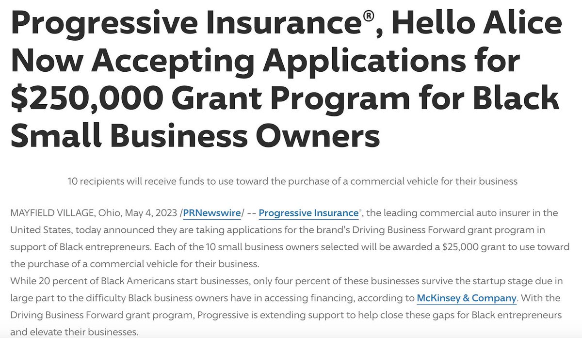 /5 We also sued Progressive Insurance for offering $25,000 grants to ten “black-owned small businesses to use toward the purchase of a commercial vehicle.”