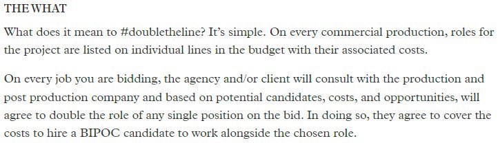 /7 AICP’s “#DoubletheLine” promotion led to agreements for the label of “DTL” to be added only to persons of color on call sheets and payroll, who then obtain positions only for BIPOC individuals, including leadership roles.