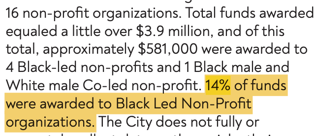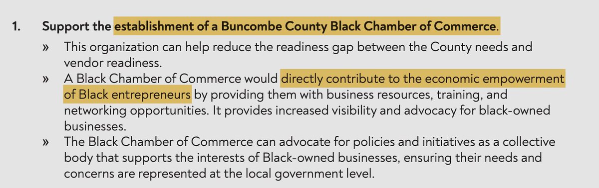 The report is furious that only 14% of total Community Development Block Grants were award to black led non profits... ...when less than 10% of the population of Asheville NC is black To eliminate the disparity, the report recommends a "Black Chamber of Commerce" Could you imagine calling for the establishment of a "White Chamber of Commerce"? No, you couldn't. Furthermore, government entities will support them through procurement and grant funding.