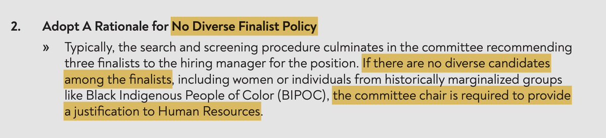 What about hiring? Well, there's a brand new policy! It is called: "The No Diverse Finalist Policy" TLDR: If there are no diverse candidates, the chair must justify this to HR. This is a real policy they want implemented. https://t.co/8eithV4gs7