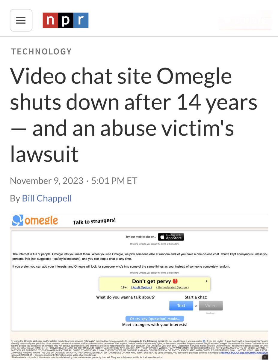 Omegle just shut down because it facilitated the sexual abuse of children who used the site to video chat with strangers. FYI: P*rnhub monetized & distributed unverified teen Omegle videos from unknown uploaders. (For one example, the video below was taken down after months of being monetized with ads on the site.) PH must also be held accountable. #Traffickinghub