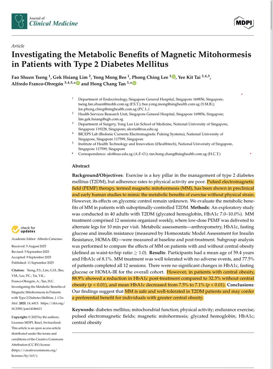 I know how wild that sounds…a magnet for fat, a field for metabolism. But a team in Singapore actually tested it. Ten minutes a week of pulsed magnetic stimulation to the LEGS of people with Type 2 diabetes. No diet change. No workouts. Yet in those with belly fat, blood sugar dropped. ~~~Doc, why should you care?~~~ Because the body is electrical, not just a bunch of chemicals These magnetic pulses act like exercise for mitochondria, gently stressing them so they rebuild, synchronize, and start burning fat again. That is amazing enough Think of it as “magnetic mitohormesis.” A pulse trains the field, not just the tissue. And here’s the fun part: the change wasn’t just local. The whole body responded, hinting at something medicine rarely measures… a field-level ABSCOPAL effect where one region’s mitochondria broadcast the new rhythm system-wide. Huge IMPLICATION ALERT That’s where the Easter Egg lives. Hidden in plain sight inside this clinical paper. The link between frequency, coherence, and metabolism might be the biggest clue yet for understanding diabetes, obesity, and the light-magnet-water axis. Scroll down, the thread reply is where the golden nugget hides. 👇