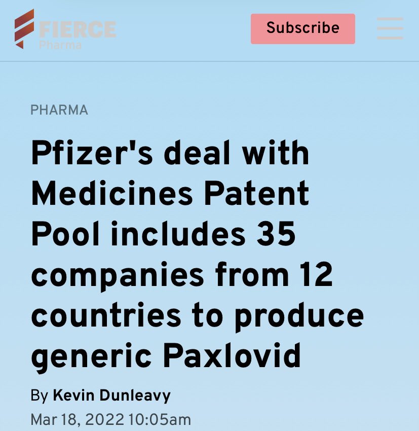 Companies even profit selling their patents to other companies. I wonder what they charge for that. 🤔 https://www.fiercepharma.com/pharma/pfizers-deal-medicines-patent-pool-includes-35-companies-12-countries-produce-generic
