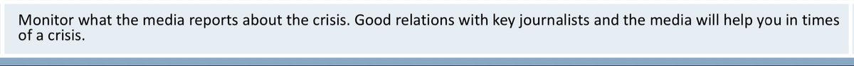 Also importantly they make sure to “Monitor what the media reports about the crisis. Good relations with key journalists and the media will help you in times of crisis.”