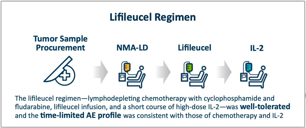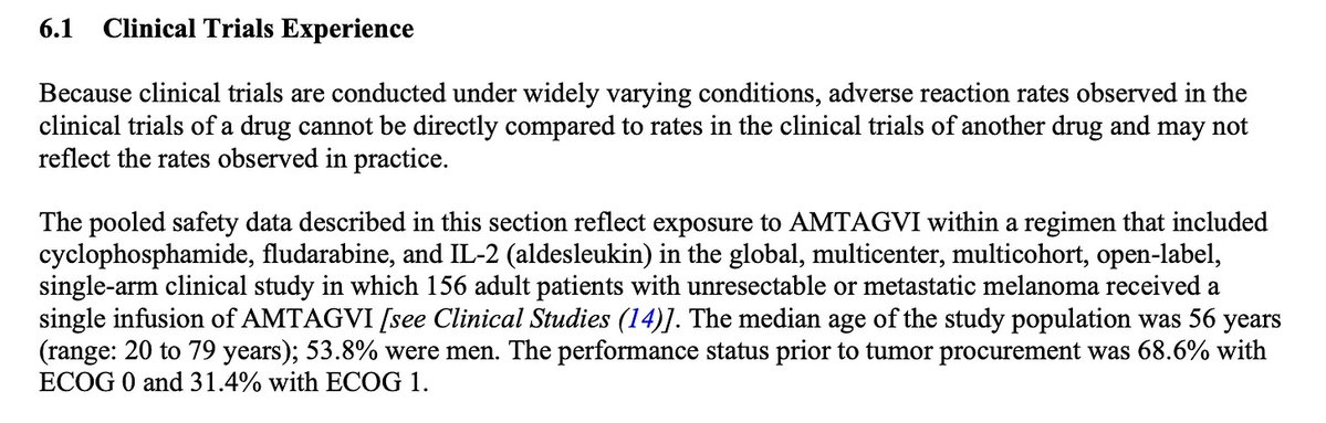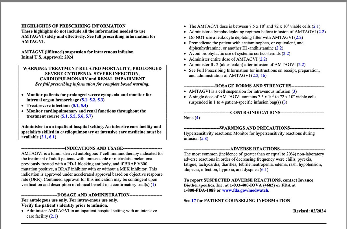 Clinical Trials Experience 156 adults who have unresectable or metastatic melanoma were given AMTAGVI. This treatment wasn't given alone; it was part of a combination that also included three other treatments: cyclophosphamide, fludarabine, and IL-2 (also known as aldesleukin). Unresectable means the cancer couldn't be removed with surgery. Metastatic means the cancer has spread from where it originally started to other parts of the body. Cyclophosphamide Cyclophosphamide is a type of chemotherapy medication. It works by slowing or stopping the growth of cancer cells in the body. Cyclophosphamide is used to treat various types of cancer by damaging the DNA of cancer cells, which makes it hard for them to divide and grow. Some adverse reactions associated with it are bone marrow suppression, nausea/vomiting, hair loss, bladder irritation and it can effect fertility. Fludarabine Fludarabine is another chemotherapy drug, but it's often used to treat certain types of blood cancers, such as chronic lymphocytic leukemia (CLL) and some types of non-Hodgkin's lymphoma. It works in a similar way to cyclophosphamide, by interfering with the DNA inside cancer cells, which prevents them from multiplying. Some adverse reactions include immunosuppression, neurological effects, bone marrow suppression and nausea/fatigue. IL-2 (Aldesleukin) IL-2, or aldesleukin, is different from the first two treatments because it's a type of immunotherapy rather than chemotherapy. IL-2 stands for Interleukin-2, which is a naturally occurring protein in the body that plays a role in activating the immune system. As a treatment, aldesleukin is a synthetic form of this protein and works by boosting the body's own immune response to help fight cancer. Some adverse reactions include capillary leak syndrome, high fever and chills, heart problems and depression. In this study: The average age of the people involved was 56, but they ranged from 20 to 79 years old. About 54% of the participants were men. Before the study started, the health status of the patients was measured using something called the ECOG performance status, which helps to describe a patient's level of functioning. 68.6% of the patients were graded as ECOG 0, meaning they were fully active, able to carry on all pre-disease performance without restriction. 31.4% were graded as ECOG 1, meaning they were restricted in physically strenuous activity but could walk and carry out light or sedentary work.