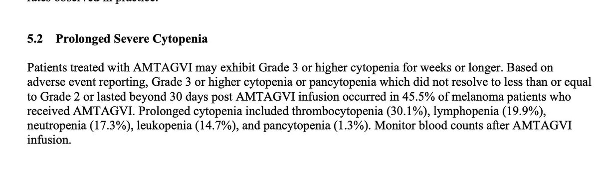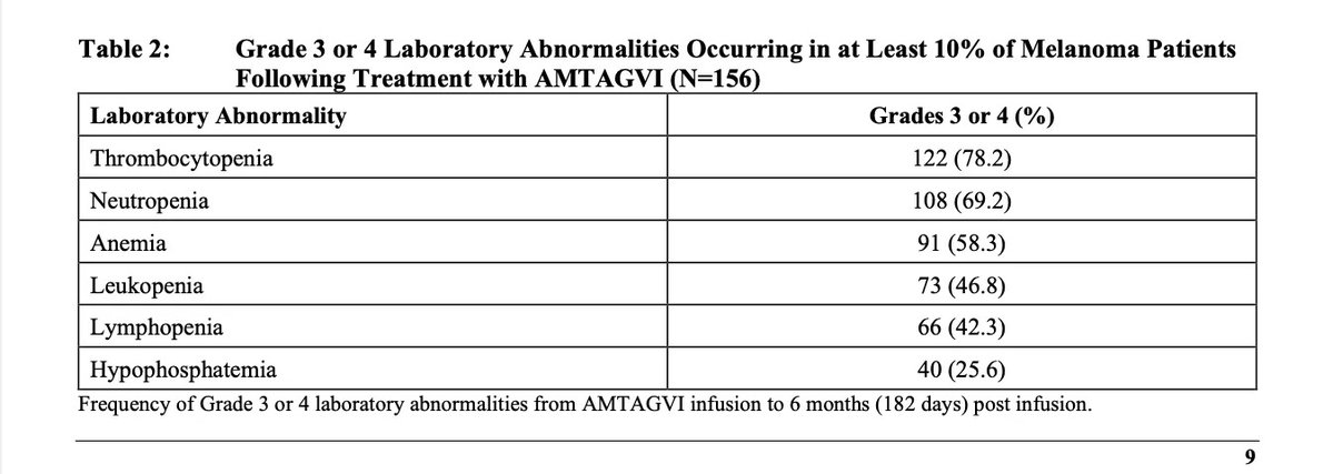These abnormalities were observed from the time of AMTAGVI infusion to 6 months afterward. Grades 3 and 4 are clinically significant and typically require intervention. (N=156) so obviously many experienced multiple of these conditions. Thrombocytopenia - 122 people (78.2%): A low platelet count, which can lead to increased bleeding and bruising. Neutropenia - 108 people (69.2%): A low count of neutrophils, a type of white blood cell, leading to increased risk of infection. Anemia - 91 people (58.3%): Low red blood cell count, which can cause fatigue, weakness, and shortness of breath. Leukopenia - 73 people (46.8%): Low white blood cell count in general, which also increases infection risk. Lymphopenia - 66 people (42.3%): A reduced count of lymphocytes, another type of white blood cell, leading to a compromised immune system. Hypophosphatemia - 40 people (25.6%): Low levels of phosphate in the blood, which can lead to muscle weakness, respiratory failure, and heart problems.