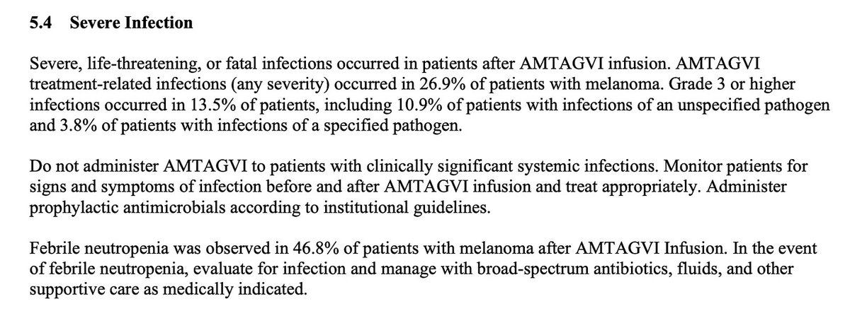SEVERE INFECTION Severe infections were also associated with the treatment. Some of these infections were so severe they could lead to death. About 26.9% of melanoma patients treated with AMTAGVI had some level of infection because of the treatment. When we talk about "Grade 3 or higher infections," it means infections that are quite severe. Out of these, 13.5% of patients had serious infections, including 10.9% where the cause of the infection wasn't identified and 3.8% where the cause was known. Febrile neutropenia is considered an emergency in medical care, especially in patients with cancer or those receiving chemotherapy, because their immune systems are already weakened, making them more susceptible to infections. Treatment typically involves hospitalization, administration of broad-spectrum antibiotics to fight potential infections, and other supportive care measures to help the patient recover while the underlying cause of the neutropenia is addressed.