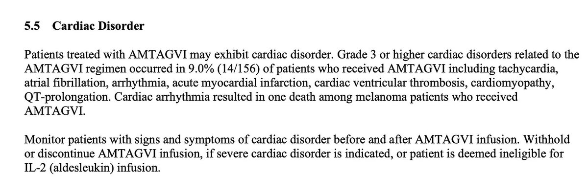 Heart Related Issues In a group of 156 patients who received AMTAGVI, about 9% (which is 14 people) had serious heart-related issues because of the treatment. These problems included: Tachycardia: A faster than normal heart rate. Atrial fibrillation: An irregular and often rapid heart rate that can increase the risk of strokes, heart failure, and other heart-related complications. Arrhythmia: Any irregular heartbeat. Acute myocardial infarction: Also known as a heart attack, where blood flow to the heart is blocked. Cardiac ventricular thrombosis: A blood clot in the heart's ventricles, which are the two lower chambers of the heart. Cardiomyopathy: A disease of the heart muscle that makes it harder for the heart to pump blood to the rest of the body. QT-prolongation: A condition that can cause unpredictable changes in the heart rhythm, which might lead to sudden, dangerous heartbeats. One person who received AMTAGVI died due to cardia arrhythmia.
