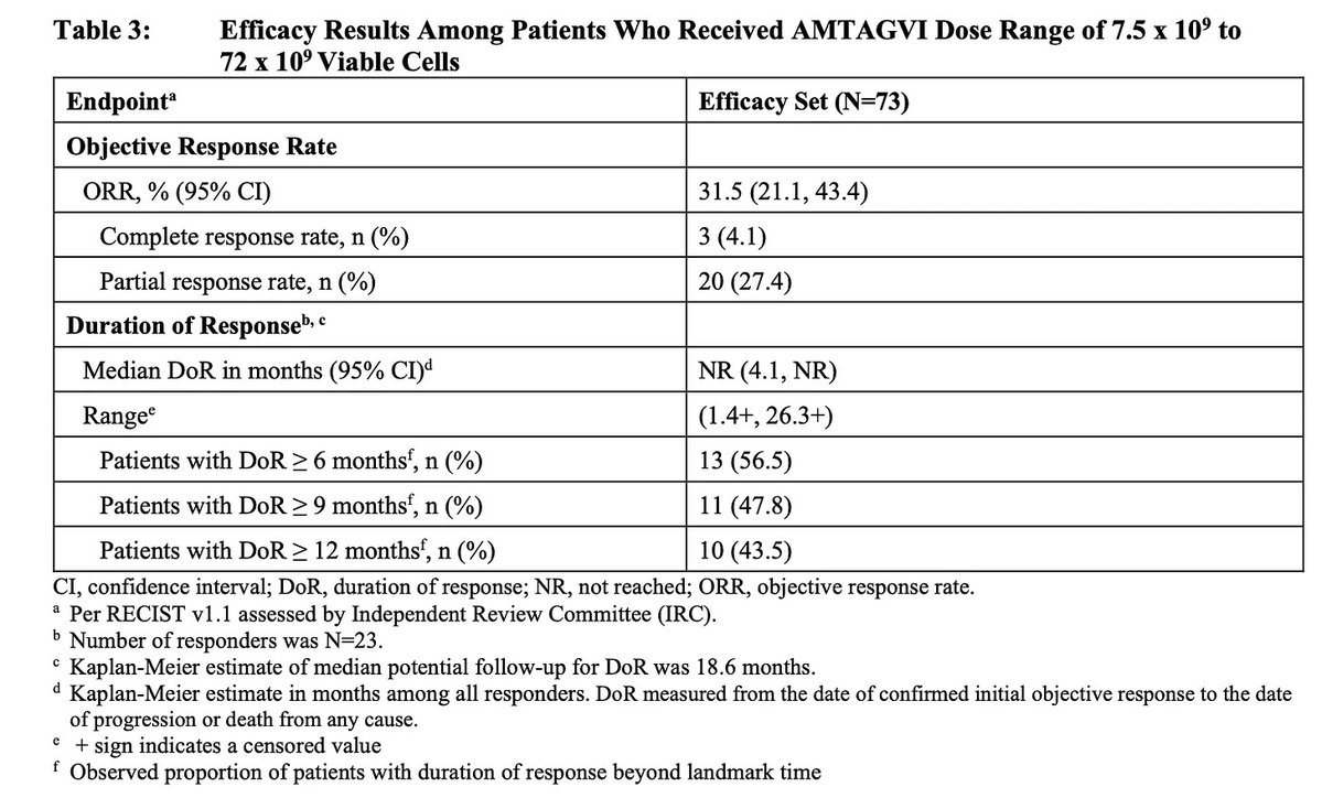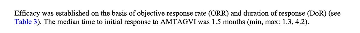 EFFICACY ENDPOINTS It is important to understand how Efficacy was established for this study, in other words what is considered a success? Let’s break down these terms to get a better understanding of what they are looking for. It is based on something called Objective Response Rate (ORR), Duration of Response (DoR) and Median Time to Initial Response. The Objective Response Rate (ORR) is a way to measure how well a cancer treatment works. Specifically, it looks at the percentage of patients whose cancer shrinks or disappears after treatment. If a treatment has a high ORR, it means that a significant number of patients had their cancer reduce in size, which is a good sign that the treatment is effective. The Duration of Response (DoR) is about how long the positive effects of the treatment last. After a patient's cancer responds to treatment by shrinking or disappearing, the DoR measures how long these benefits continue before the cancer starts growing again or becomes noticeable. A longer DoR means that the treatment's effects are lasting for a good amount of time, which is what doctors and patients hope for. This term refers to the middle value in the range of times it took for patients to first see a response to the treatment. In the case of AMTAGVI, the median time to initial response was 1.5 months, with the quickest response being at 1.3 months and the slowest at 4.2 months. This means that half of the patients started seeing their tumors reduce or go away at or before 1.5 months after starting the treatment. It gives an idea of how quickly you might expect to see results from the treatment.